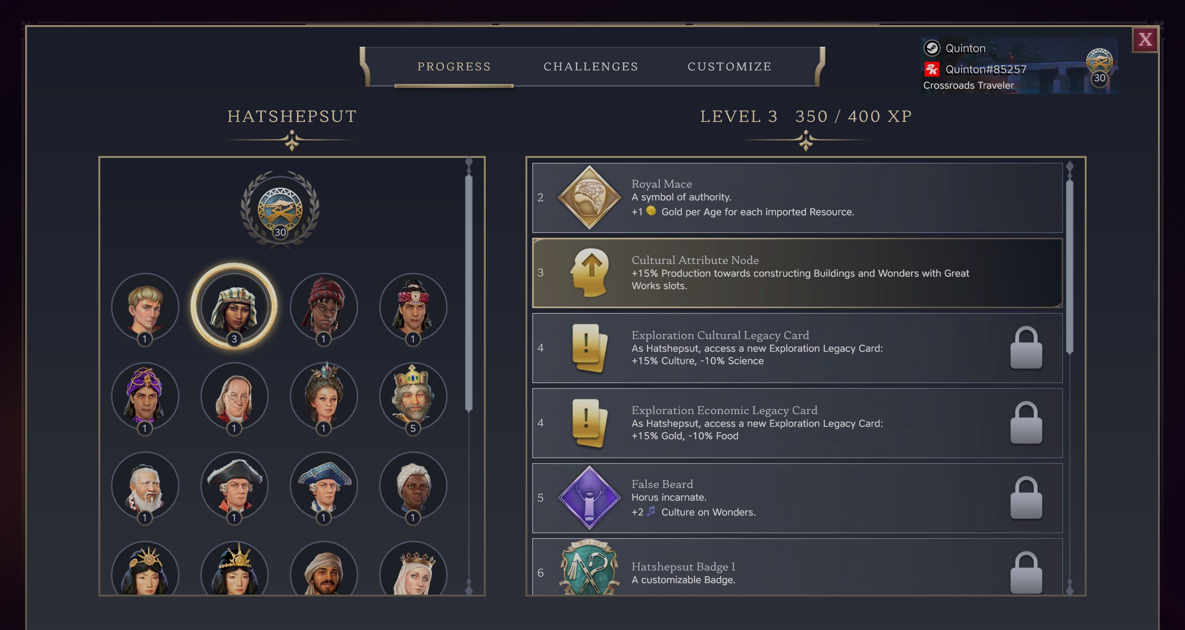 リーダー固有の記念品は、お気に入りのリーダーと遊ぶことでロック解除されます。記念品はuですそのリーダーのプレイスタイルにリンクしています。たとえば、Ibn Battutaは、Scout Visionを+1で増やす素晴らしい初期の記念品を受け取ります。