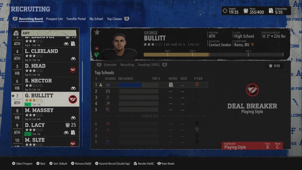 ディールブレイカーは他のグレードと同じですが、より多くの重さを帯びています。それらに失敗すると、すべての交渉が自動的に終了します(アスリートがプログラムに関心を持っていたとしても)。