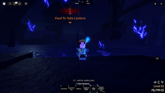 あなたも必要ですアビスサルひげを生やしたシーデビルそしてaボイドグローゴーストフィッシュ。ありがたいことに、アビスサル天頂の漁場は、洞窟の入り口のすぐ近くにあります(上記のスクリーンショットに示されている釣り人のランタンを手に入れるために使用する同じ水域にあります)。