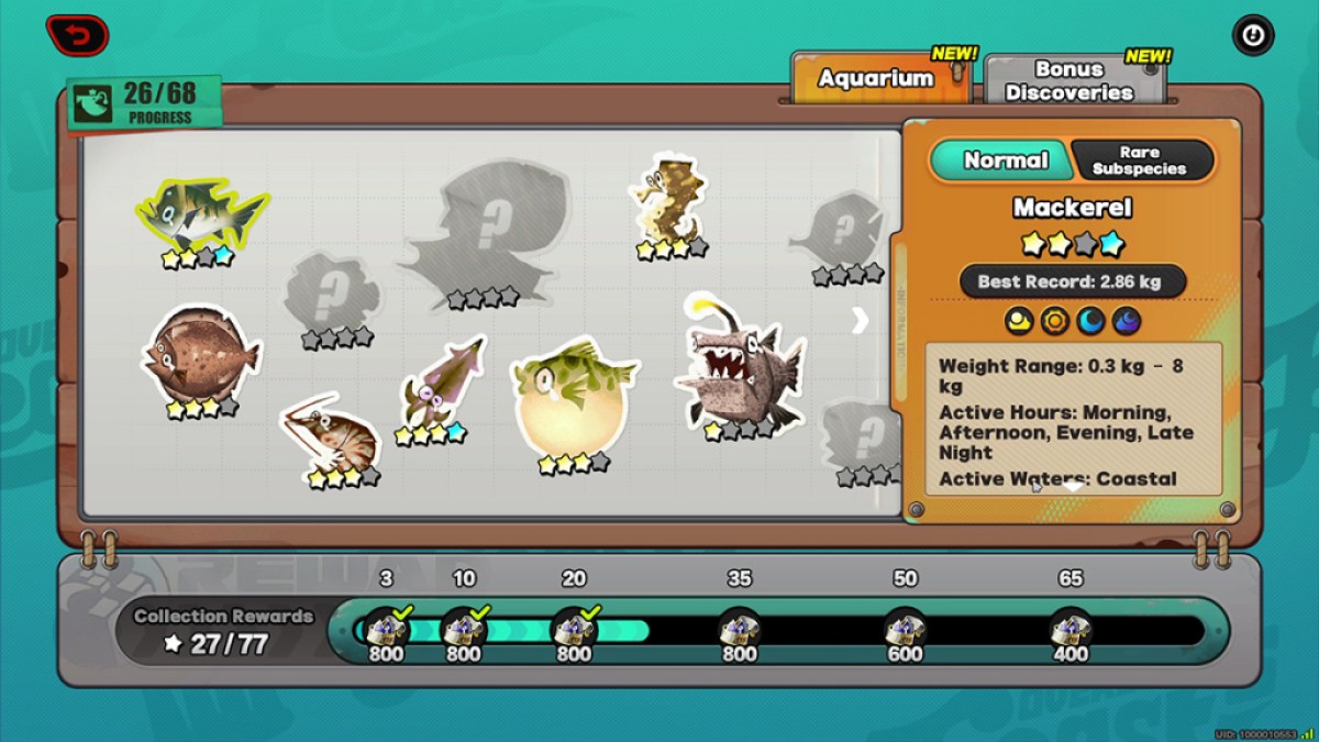 Elpis Ultimate Angler Championshipで釣りをすることで見つけるべき17の通常の魚と9つのボーナス発見があります。通常の魚には、1つから4つの星の範囲の4つの品種があります。星のランキングは体重に基づいており、執筆時点では、魚の重量はそれぞれを捕まえるものにランダムです。 4番目の星は珍しい亜種にも特有なので、それを手に入れるには、その魚の黄金のバージョンを捕まえる必要があります。