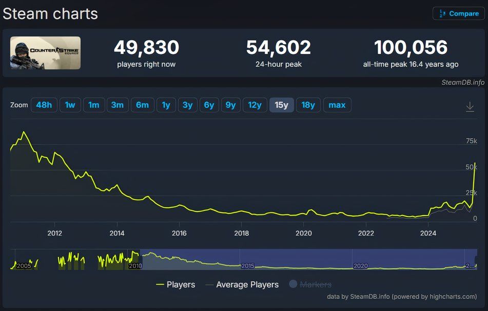 からのデータによると、週末にSteamDB、カウンターストライク:ソースは56,987の驚異的な同時プレイヤー数に達しました。それは、Helldivers 2のようなゲームよりも多くのプレイヤーであり、週末にSteamで到達したかどうか、そしてOverwatch 2と苦労しているMecha Breakの2倍以上のプレイヤーです。