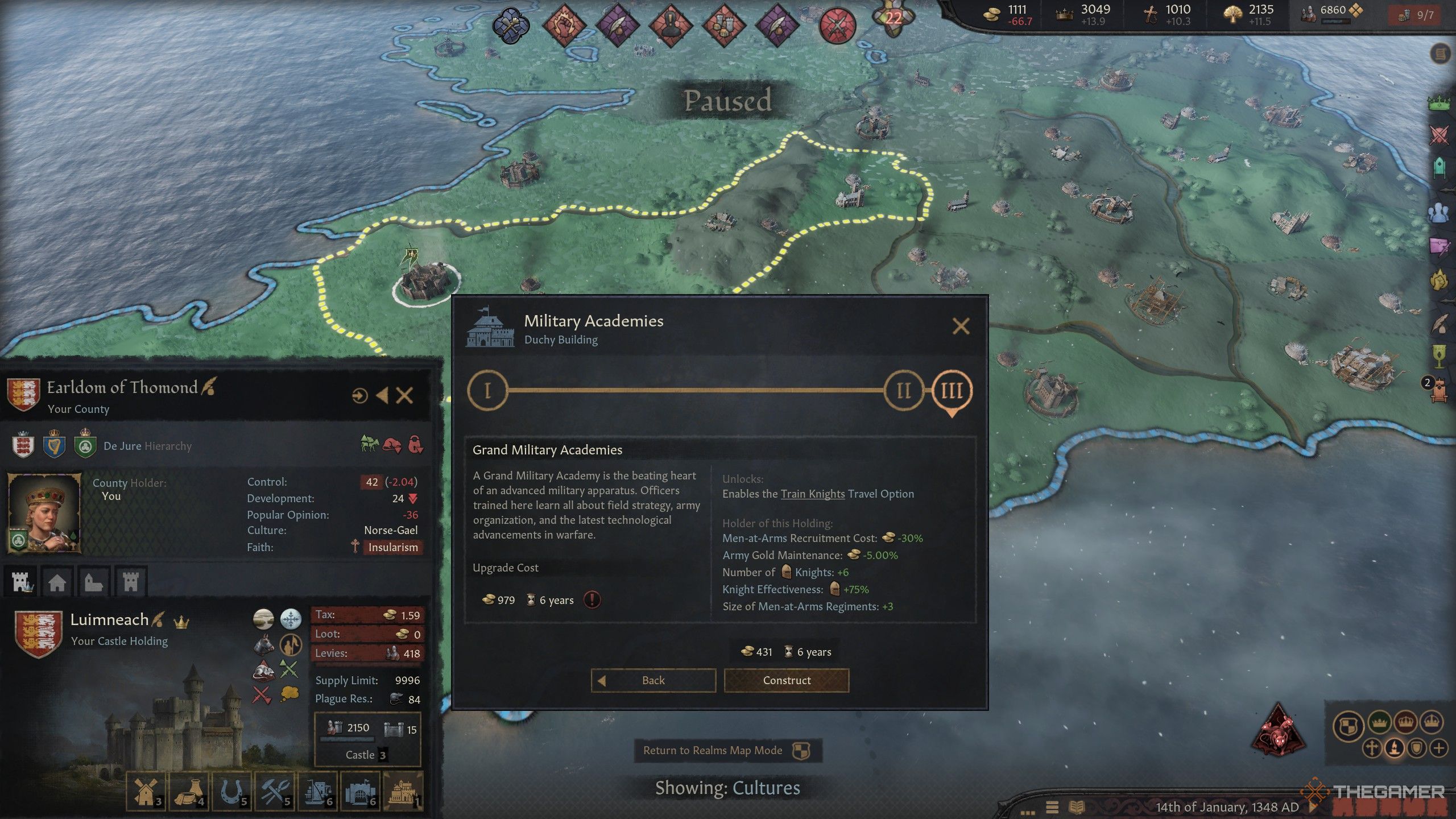 最大では、最大6人の騎士を獲得できますが、その有効性は75%増加します。各MAA連隊のサイズも+3に増加しますが、陸軍の維持は5%減少し、新しいものを採用すると30%安くなります。しかし、最も強力なのは、旅行中に騎士を訓練する能力です。これにより、彼らの武道の統計に巨大なブーストが得られる可能性があり、戦闘で無敵にすることができます。