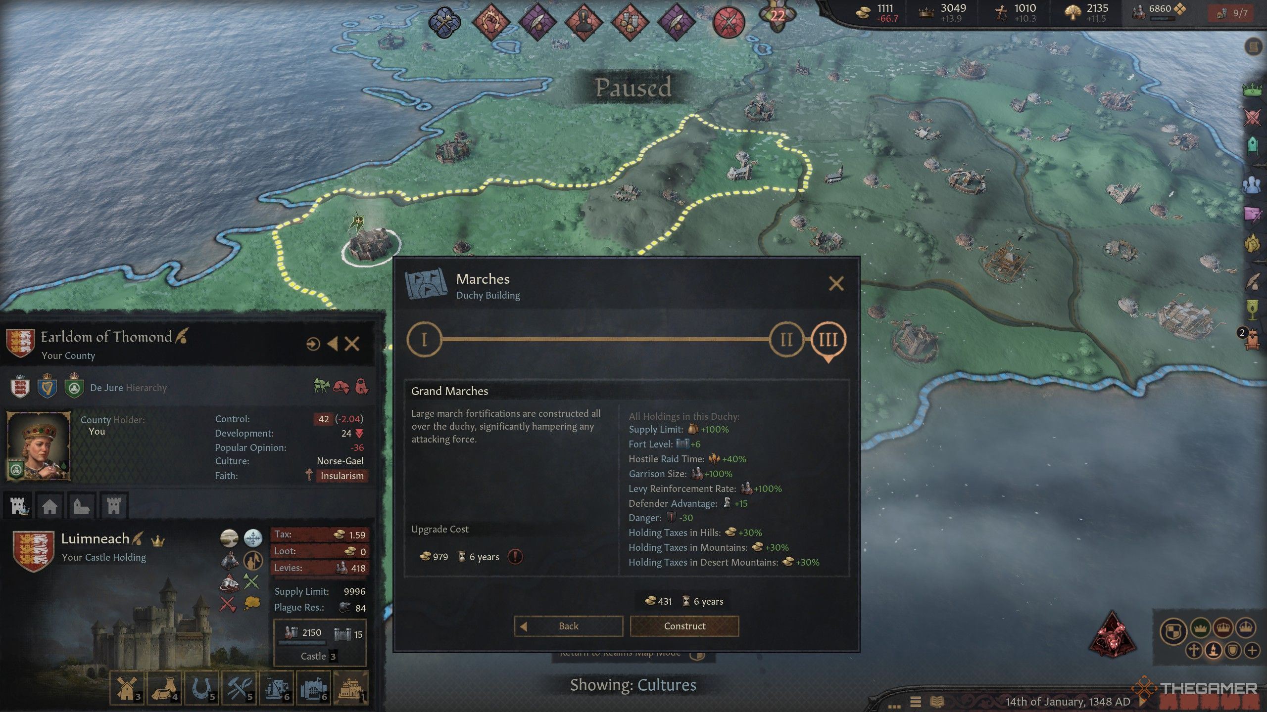 行進は公国内の供給制限を増やし、消耗を恐れることなくここに巨大な軍隊を連れてくることができ、同時に、守備隊のサイズ、砦のレベル、この公国での襲撃にかかる時間を増やします。あなたの課税もより速く強化し、あなたは防御するときにボーナスを得ることができます。そして、戦争以外でさえ、この公国の丘、山、または砂漠の山の地形からあなたの税金を増やします。