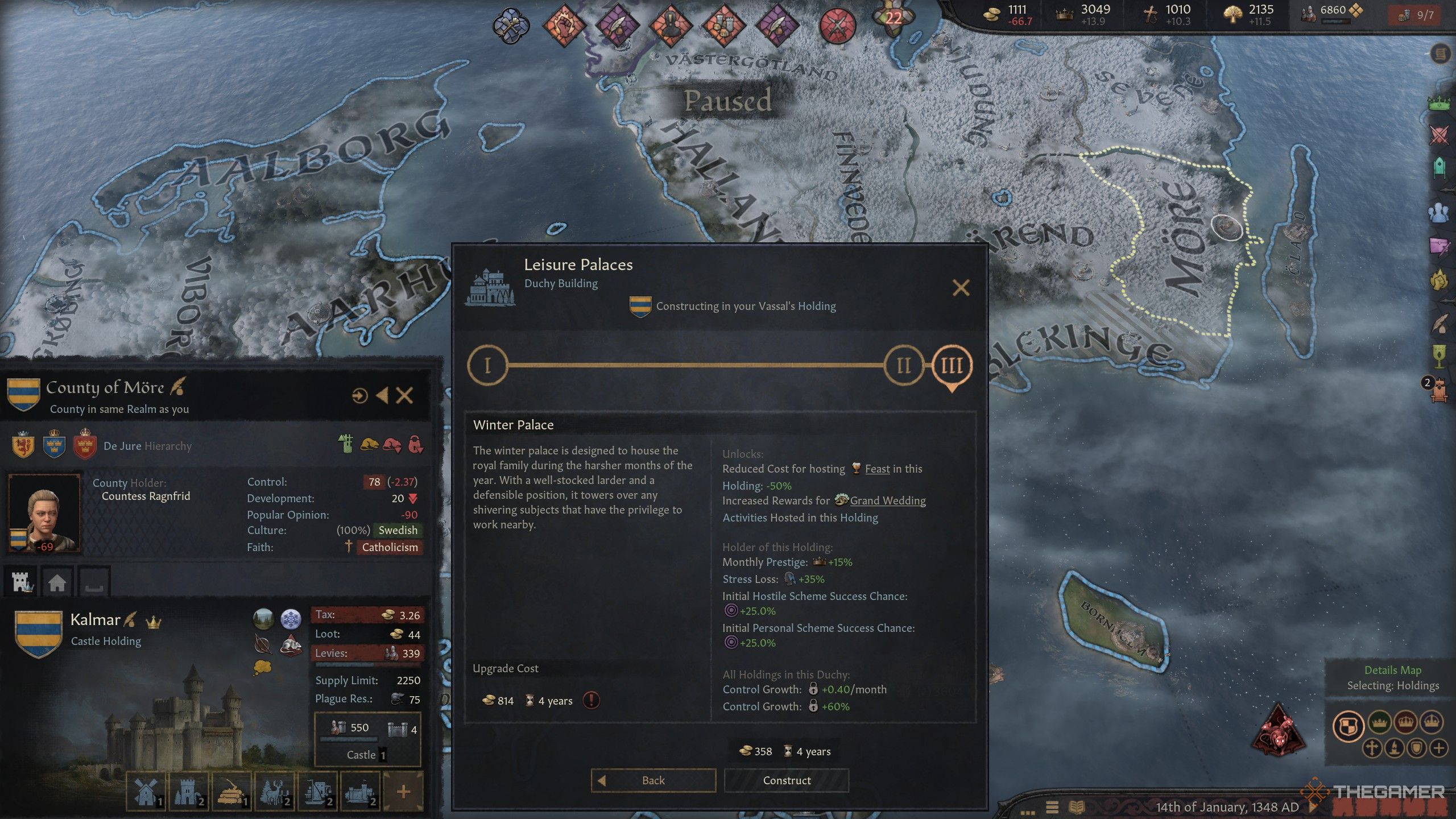 余暇の宮殿は、それがあなたの忠実な家臣であろうと、公国内の農民であろうと、自宅で平和を維持することです。これが構築されているホールディング内では、ここでホストされているごちそうを50%割引し、より多くのストレスを失い、壮大な結婚式からより有名になります。