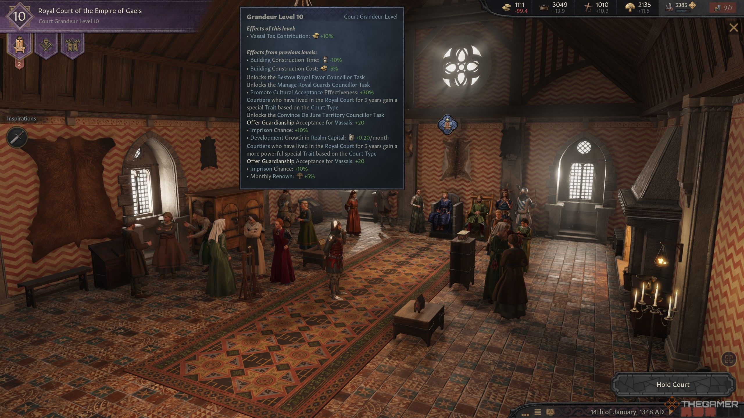 これが、アメニティのレベルを上げることが非常に重要な理由です。それは非常に高価になる可能性がありますが、同様に大きな利点があります。あなたの王室は、外交や好戦的なような多くの異なる形態を引き受けることができます。より高いレベルの裁判所の壮大さは、これらの裁判所の強力な効果が活性化されることを保証します。例えば、レベル4の裁判所の壮大さを持つ好戦的な裁判所は、あなたの騎士団 +10%の有効性を与えますそして、あなたの強力な家臣からの+10の課税。