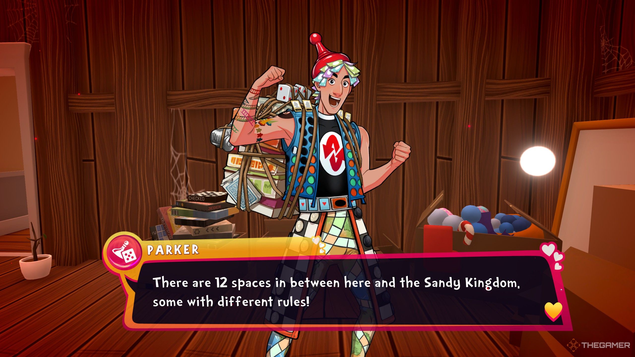 Sandy Kingdomは、Parkerと一緒にプレイする最初のゲームです。これは、リニアモノポリーのようなスタイルのゲームです。ナビゲートする12のスペースがあります、そして最初に終わりに到達する人が勝者です。パーカーは、どの作品になりたいかを選択できますが、これはゲーム自体とは無関係です。特にあなたは実際にそれを見ることができないので。