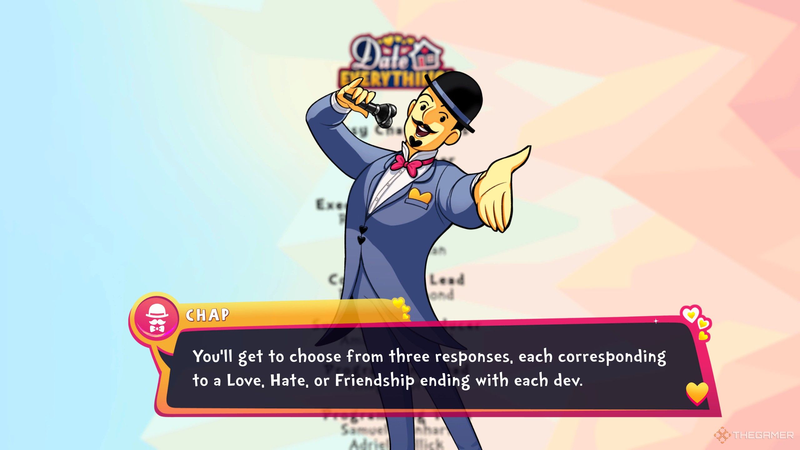 この場合、生意気なチャップはホストであり、あなたは出場者です。あなたが勝つことを目指しているのは彼の心ではないことを除いて、それはゲームの開発中にスタジオにいるすべての開発者のものです。合計33人の開発者があり、すべて愛に利用できます。心配し始める前に、それは意味がありません33の真新しいデータがあります。彼らはそれぞれ、ゲームショー中にサッシーチャップとの会話です。