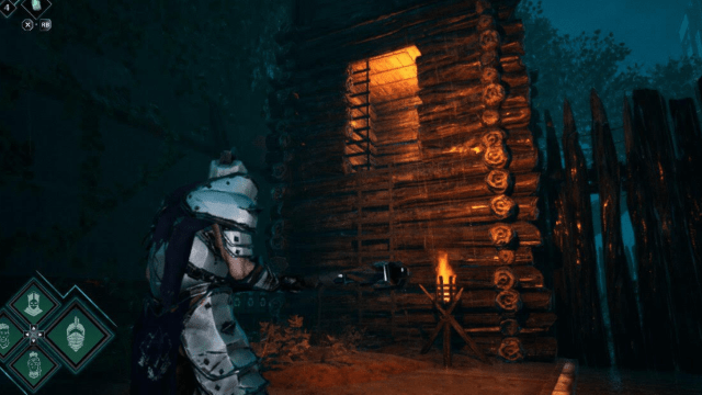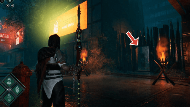 この建物に到達するには、道路の最初のターンに到達するまで、高地の最初の門の北に向かいます。右に進み、到達するまで続けてください建物の巨大なオレンジサインの隣にある2つの燃えるトーチ。燃えるようなトーチを通り抜けて、ガードとポベルを見つけます。