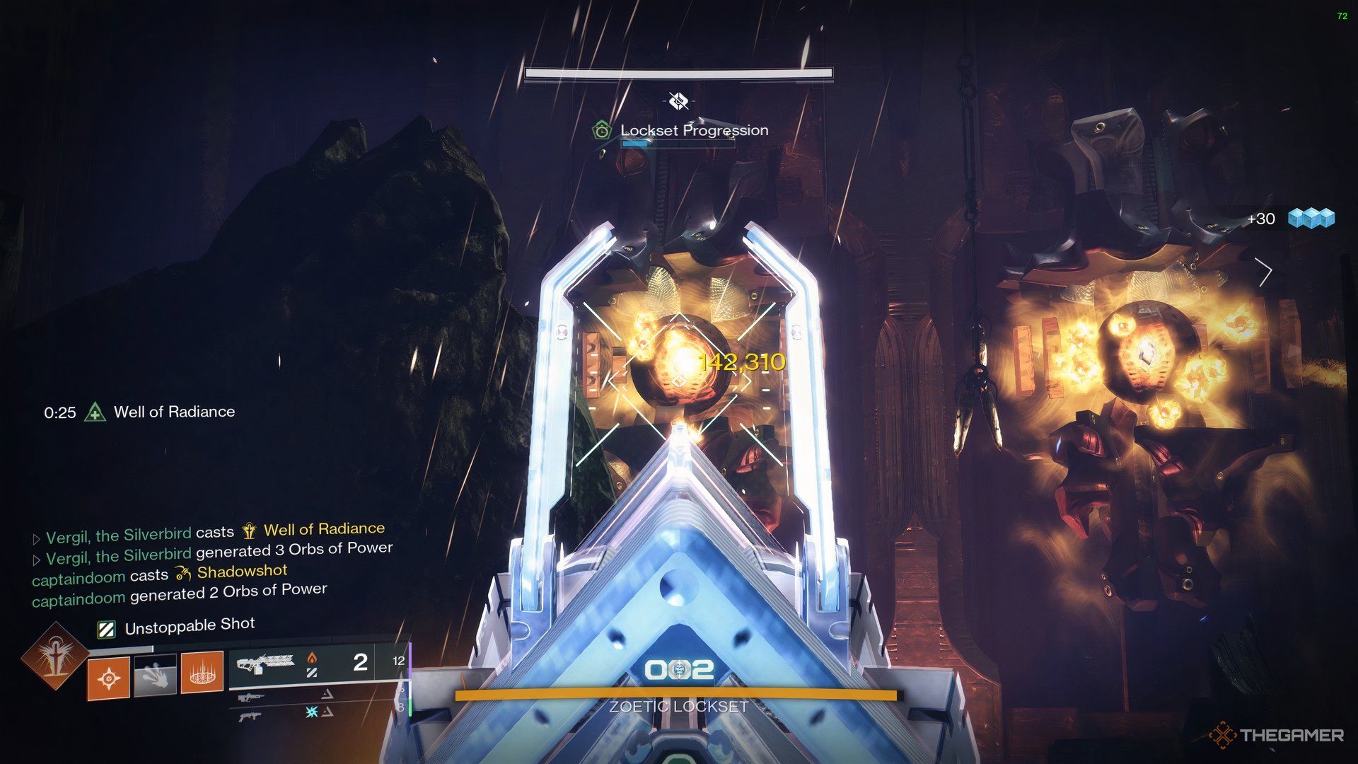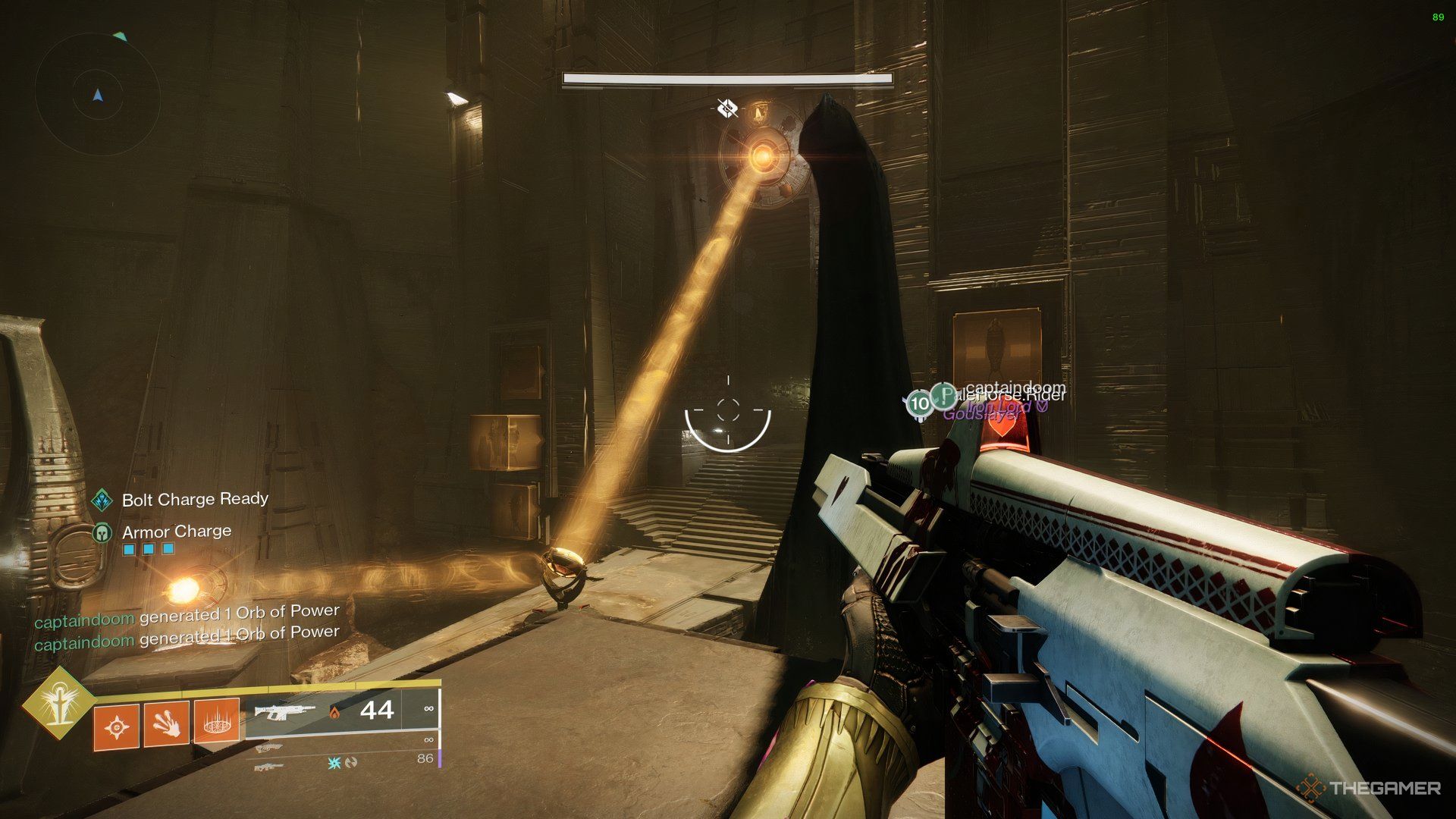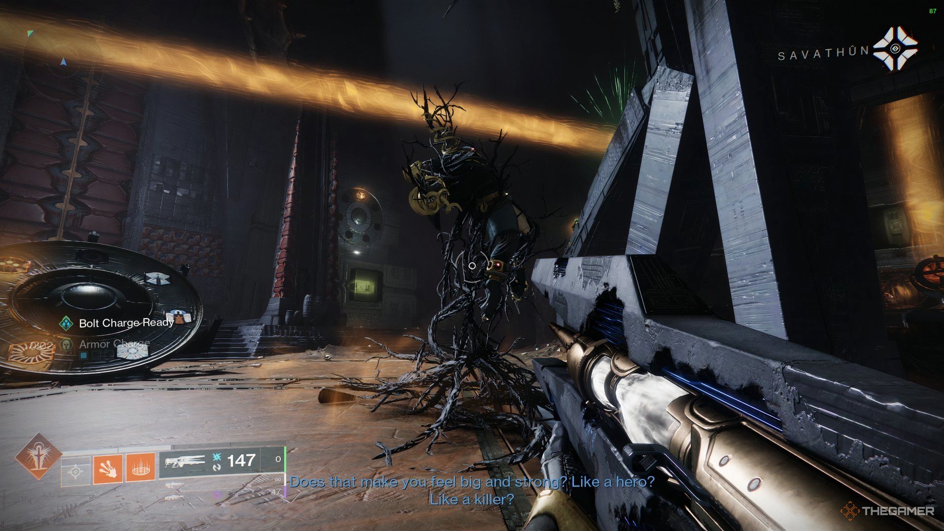 シールドがゼロになったら、輝きの井戸を置き、ボスにダメージを与え始めます。上司は、あなたが井戸の中に立っている限り、あまりしません。しかし、彼は時々彼を使うでしょうストランドはあなたを自分自身に引き寄せる力を与えますそして、あなたをどこにでも置きます。いつでもチームに戻ることができますが、柱やカバーの後ろに立っている場合、ストランドウェブはもう引っ張られません。