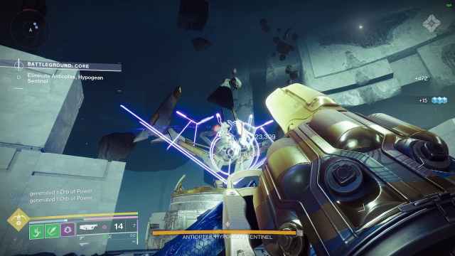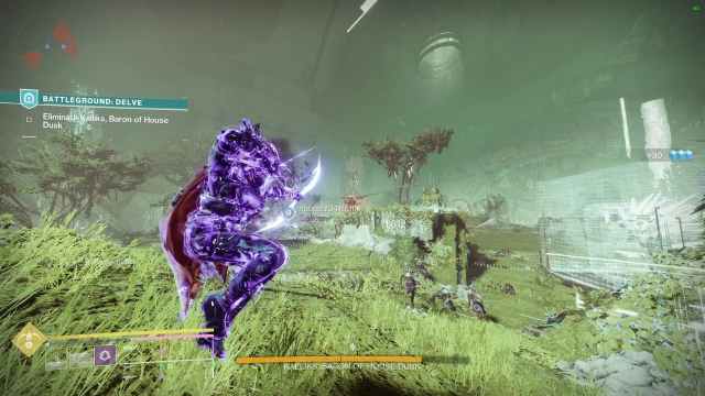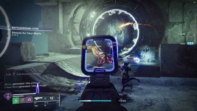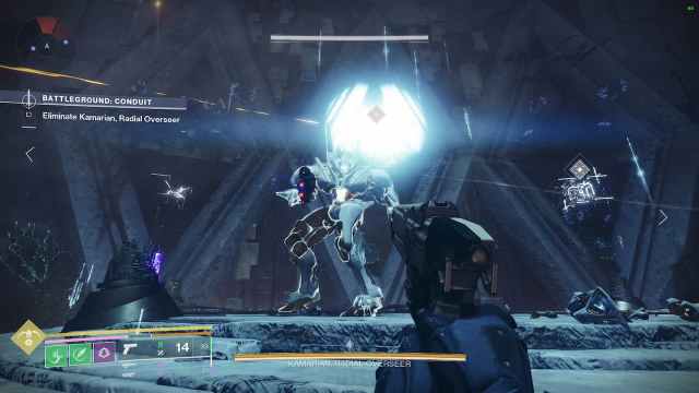 保護者の任期のチームでミッションを開始するか、ゲームを他の2人と一緒に扱い、ミッションに向かいます。最後の戦場の以前の最終エリアを歩くと、大きな荒廃したボールがある部屋に行くことができます。絶対ですエッセンスベアラーという名前の大きな黄色いバーの敵を倒します、彼らが落とすボールを拾い、枯病に投げます。