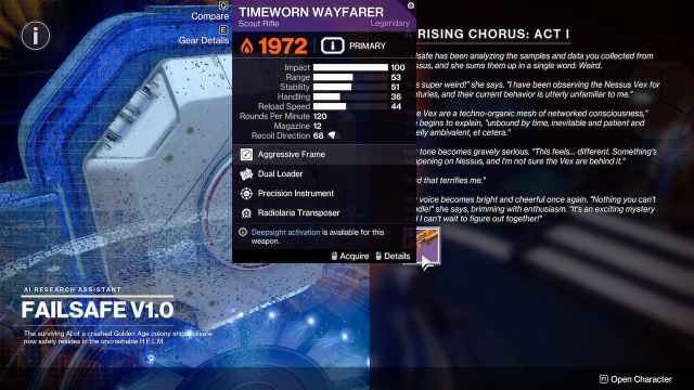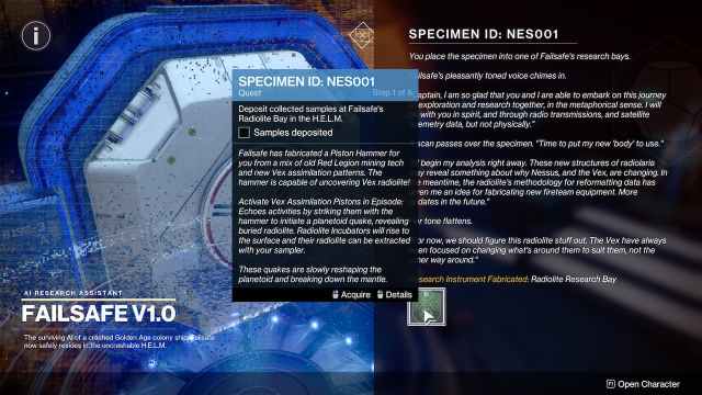 あなたがする必要がある唯一のことは、彼女とやり取りすることによって失敗に報告することです。彼女は、Vexの奇妙な行動の背後にあるアイデンティティはおそらくもっと研究したい謎であることに注意します。収集した標本には、NES001と名付けられますそして、新しいクエストと機能を開きます。RadioLife Research Bay。彼女もそうしますであなたに報いるタイムワームウェイファーラースカウトライフルそして、あなたを任せます。
