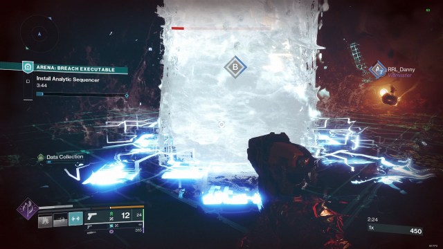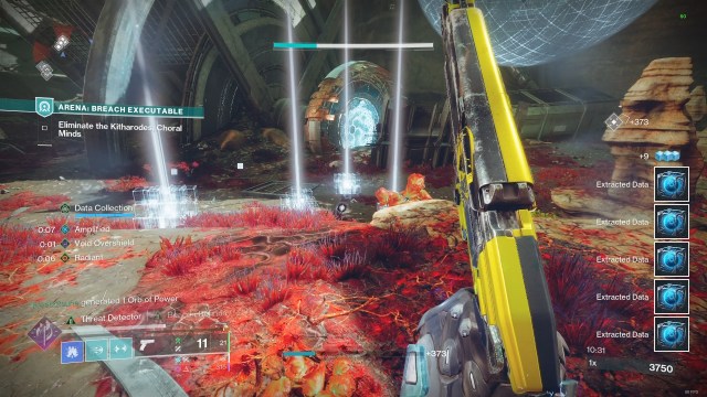 すべてのタスクには、ドロップする敵またはターゲットがあります抽出されたデータキューブ、それらが発する光の白い梁のおかげで見やすいです。キューブを収集するとき、aデータ収集バー画面の左側で充填が開始されます。