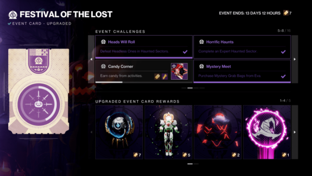 | キャンディコーナー | 失われたフェスティバル中に十分なキャンディーを獲得してください | 最終化されたゴーストマスクオーナメント、1エンハンスメントプリズム、1イベントチケット |