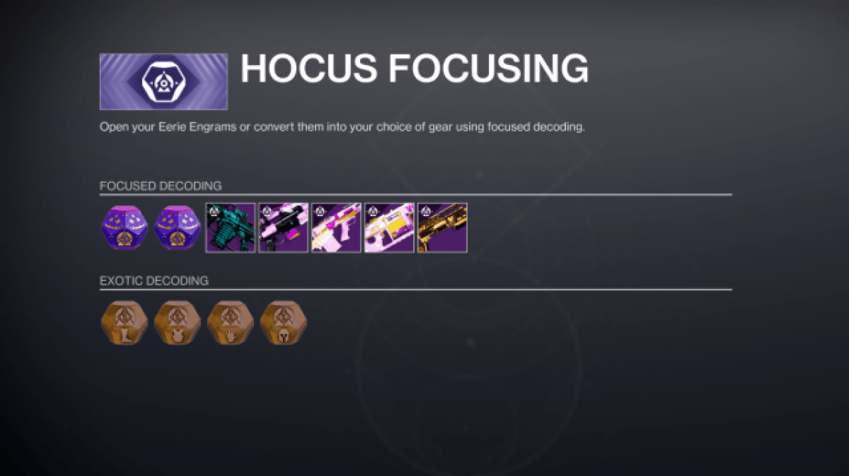 | ホーカスフォーカス | 不気味なエングラムを集中します | タワースタッフマスクオーナメント、10000グリマー、1つのイベントチケット |