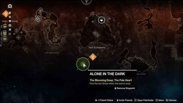 前述のように、暗いクエストの単独でのあなたの最初のタスクは、淡い心臓に散らばっている幽霊を見つけることです。これは幽霊の大きさを考えると不可能な仕事のように思えるかもしれませんが、画面上のマーカーとマップで強調表示されているおおよその領域が監督されます。したがって、最も近い速い移動ポイントに移動し、マーカーに従ってゴーストに近づきます。