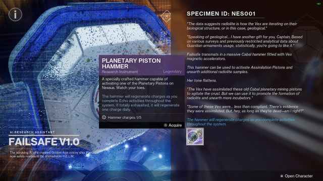 Planetary Psiton Hammerの使用と充電を開始する前に、それを手に入れる方法とそれがどのように機能するかを把握したいと思うでしょう。ピストンハンマーは、エピソード1:エコーの新しいエピソードアクティビティの一部です。具体的には、開始する必要があります標本ID:NES001クエストそして、初めてFailSafeと話す必要があるまで進歩します。