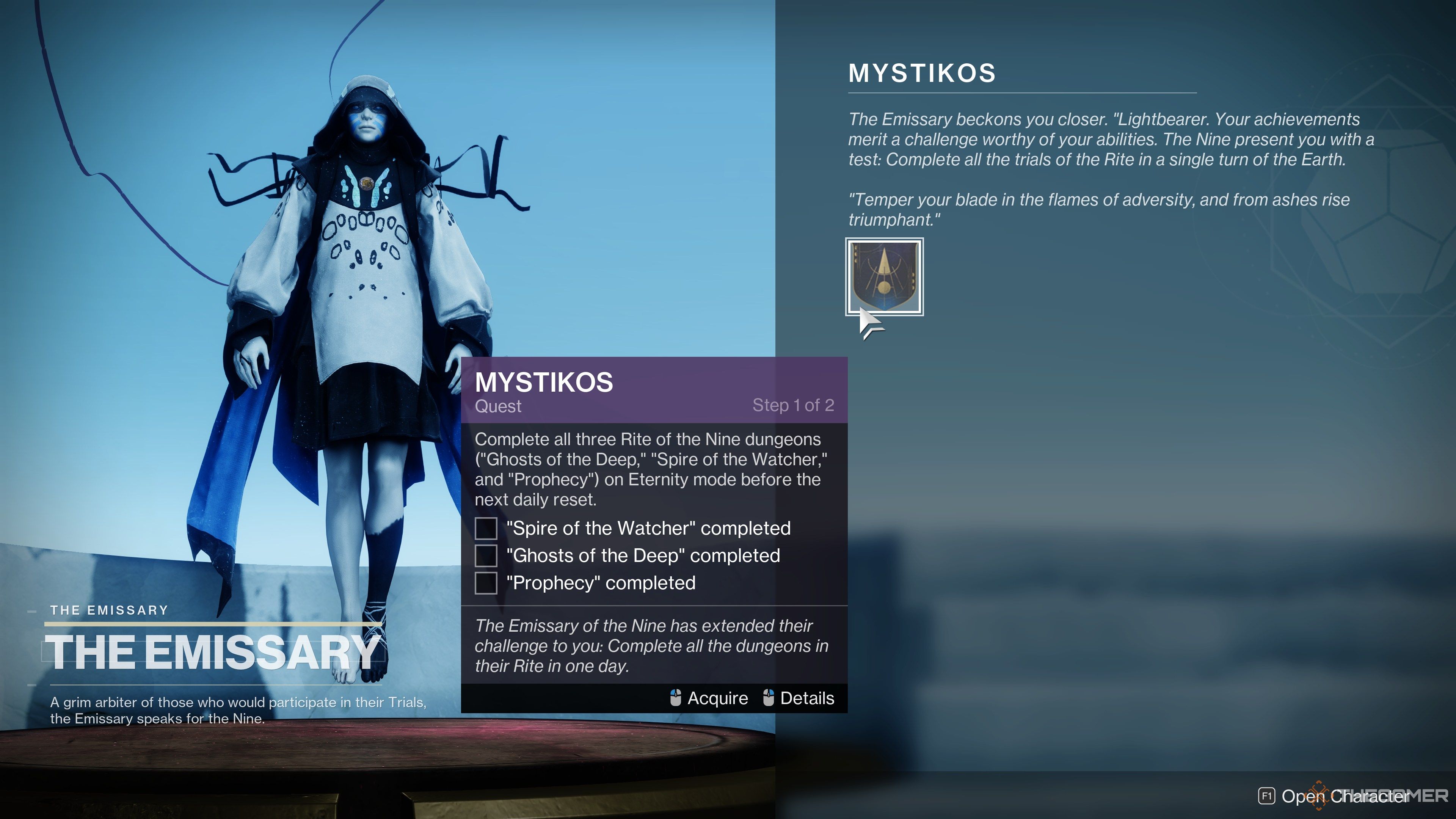 Mystikosは、9人の儀式の最終週に利用できる新しいクエストであり、次の毎週のリセットの前に、3つのROTNダンジョンすべてをクリアします。ダンジョンがクリアされる場合があります永遠の困難; ExplorerとUltimatumはカウントされません。このクエストを完了すると、「ガントレットの実行」の勝利が完了します。あなたが完了したくないそのタイトルから特定の勝利がある場合、あなたはその代わりにMystikosを完成させることができます。