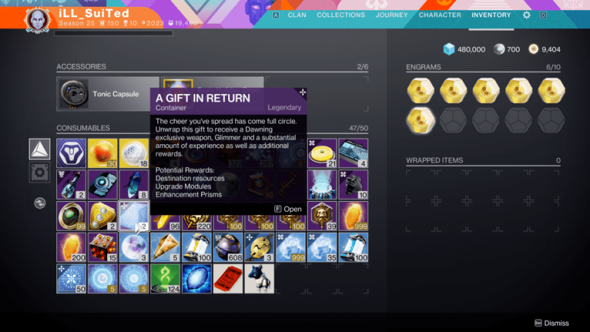 あなたがあなたの敵から集められた材料を焼いて、あなたの同盟国への御treat走としてそれらを届けた後、あなたはおそらく感謝の手段として見返りのアイテムの贈り物の隠し場所を獲得したでしょう。これらの項目は、一般的なクラフトの報酬、夜明けの記念品、または上記のまれなエンブレムのために、在庫ページから個別に開くことができます。それ以外の場合、プレイヤーはエヴァレバンテを通じて特定の報酬に焦点を当てるために、見返りのアイテムにギフトを使用できます。