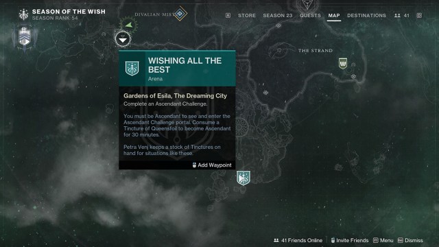 アセンダントチャレンジを完了します。これがそうです私があなたを失望させなければならないところ。このステップに到達するときに応じて、夢の都市のどこかにアクセスできる別のアセンダントチャレンジがある可能性があります。それらのそれぞれは機械的に異なり、さまざまな方法を使用して開始しますが、すべての共通点が1つあります。クイーンズフォイルのチンキを使用して、それらにつながるポータルを見る必要があります。 Petra Venjは、数千のグリマーでそれらをあなたに売っています。チャレンジにつながるポータルの位置は、あなたの夢のような都市の地図にありますが、それらに到達する方法はさまざまです。