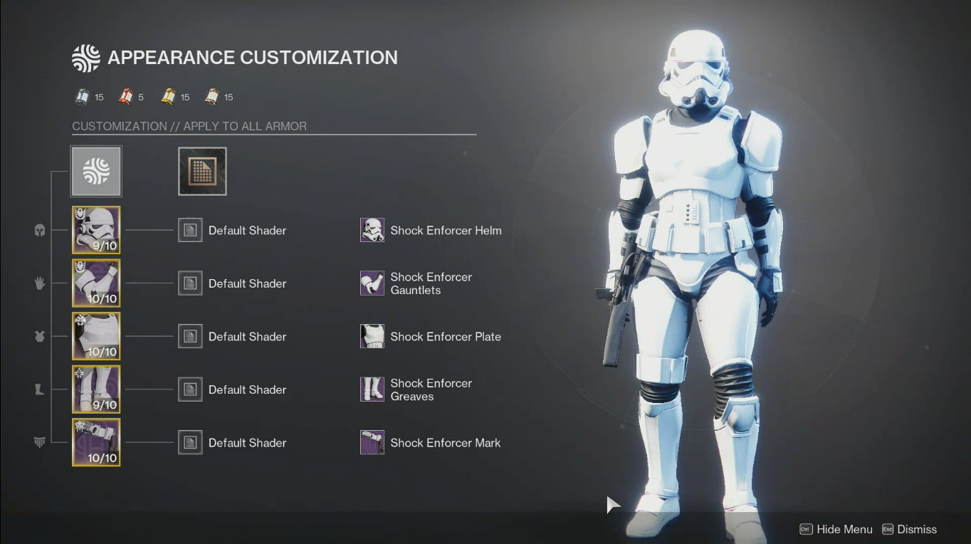 最後になりましたが、確かに、タイタンは最も象徴的なセットを獲得します。デストルーパーズの黒とロイヤルガードの赤は、最前線を燃やすクラスのために救われた古き良きストームトルーパーホワイトと比較して何もありません。そして、あなたが悪い目的の日を持っているなら、あなたはいつでもそれをスーツで非難することができます。
