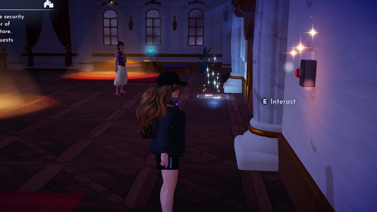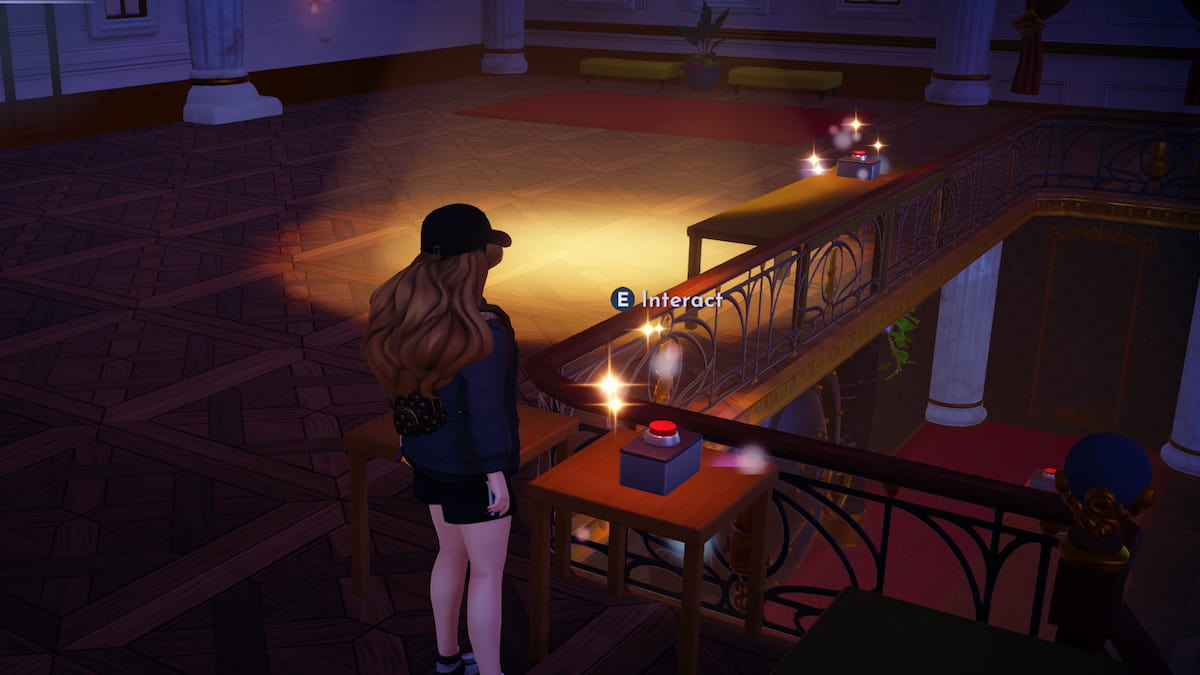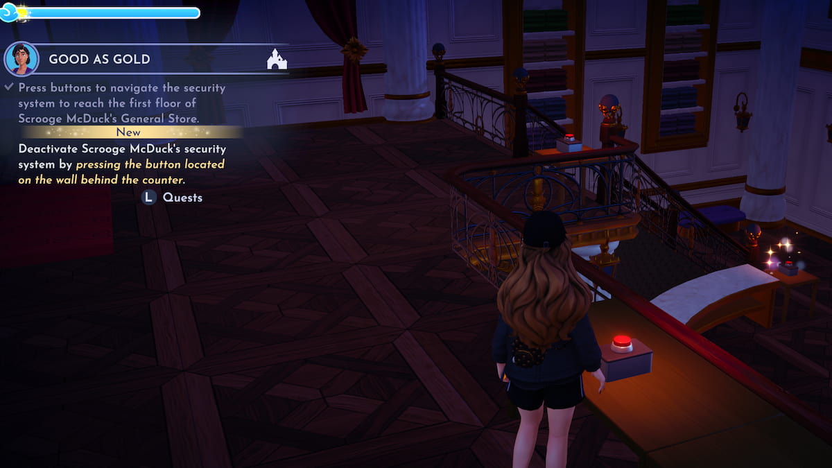 正しい服を着たので、Scrooge McDuckの店の壁に大きな赤いボタンを押してステルスミッションを開始できます。あなたとアラジンは最上階にテレポートし、そこで彼はメカニックを説明し、それをさらに詳しく説明するチュートリアルを提供します。今のところ、簡単に実行してテーブルのボタンをアクティブにして、最上階のライトをオフにすることができます。