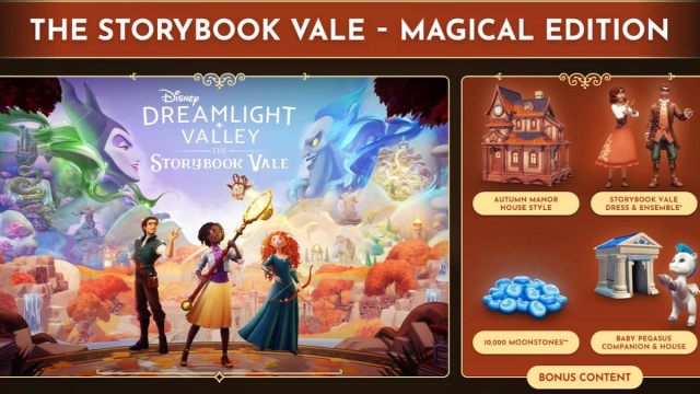 | エンチャントエディション | 79.99ドル | ディズニードリームライトバレーのベースゲーム、すべてのストーリーブックベールコンテンツ、すべてのタイムコンテンツ、18,000ムーンストーン、秋のマナーハウススタイル、ストーリーブックベールドレスとアンサンブルの衣装、ベビーペガサスコンパニオンとハウスへのアクセス。 |