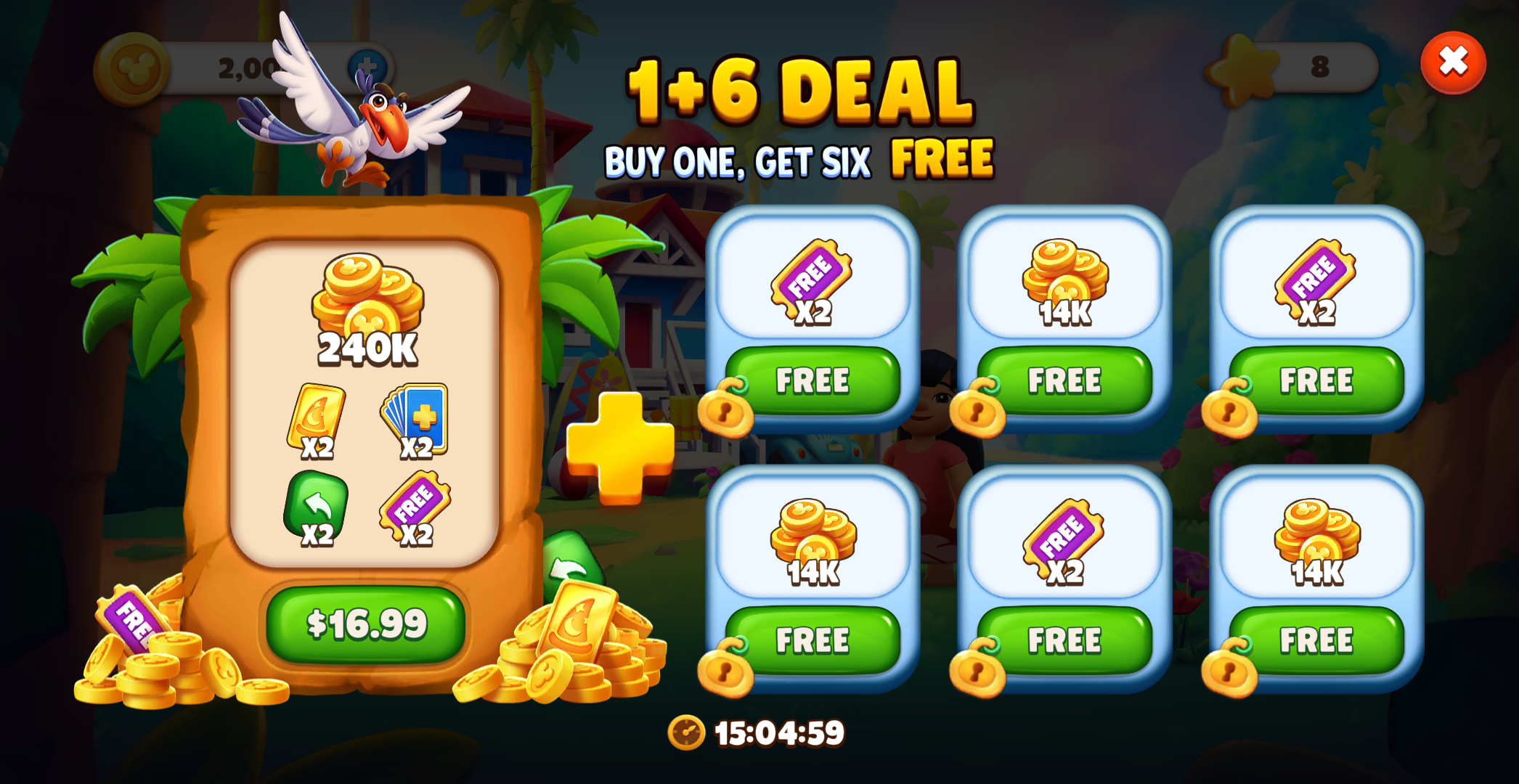 ディズニーソリティアのマイクロトランザクションの要素は、罪のないものから実に悪意のあるものまであります。ゲームをロードするたびに、3つまたは4つの異なる限定時間の取引が提供されます。今すぐ行動して、400%以上の価値を得てください! Chip&Daleの2倍のコインのダブルアップオファーをご覧ください!アリエルのオーシャントレジャーをご覧ください、最初の3つは無料で!