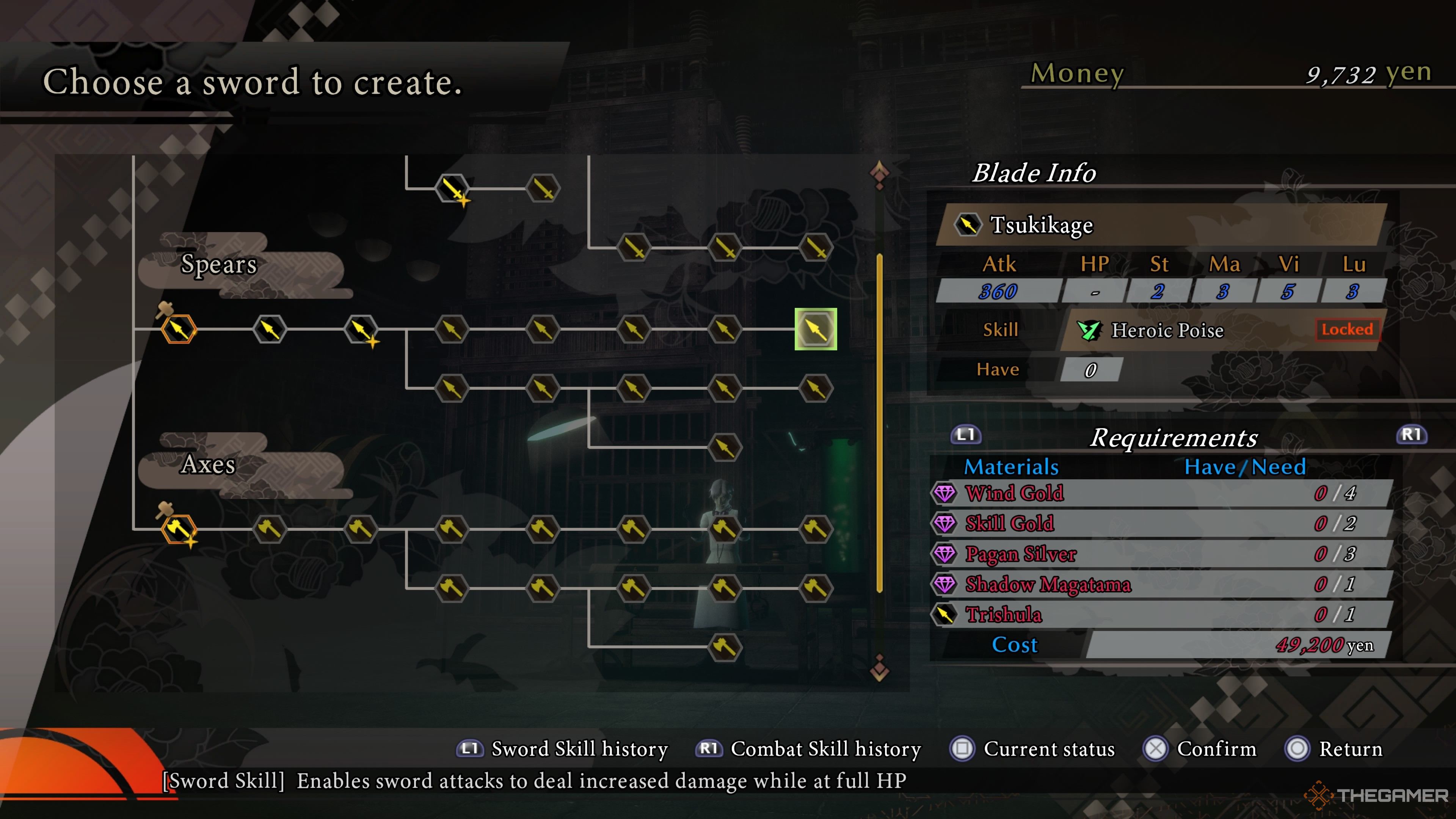剣の錬金術メニューの槍の進行のメインラインにある最後の槍の名前は、「ムーンライト」の日本語であるツキケージと呼ばれます。ステータスが大きく広がり、印象的な360攻撃があります。スピアーズがあなたに与えるスピードのファンなら、ツキケージは取り組む価値があります。