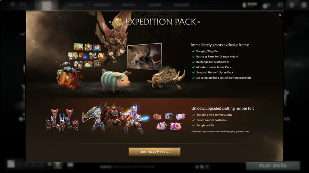 アップグレードされたセットに加えて、Dota 2 x モンスター ハンター エクスペディション パックには、ドラゴン ナイトのエルダー ドラゴン フォームに代わるリオレウス、ビーストマスターのイノシシの呼び声としてのブルファンゴ、モンスター ハンター ミュージック パック、季節のスプレー、クラフト素材のスターター バンドルなど、追加のテーマ コンテンツが含まれています。