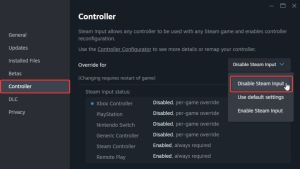 - でコントローラタブ、選択します蒸気入力を無効にします下のオプションドラゴンエイジのオーバーライド:ベルガード