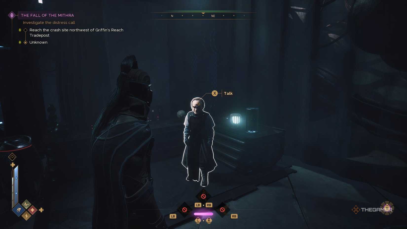 NPCの場所の良い指標はフローティングホログラフィックヘッド彼の診療所のすぐ外。