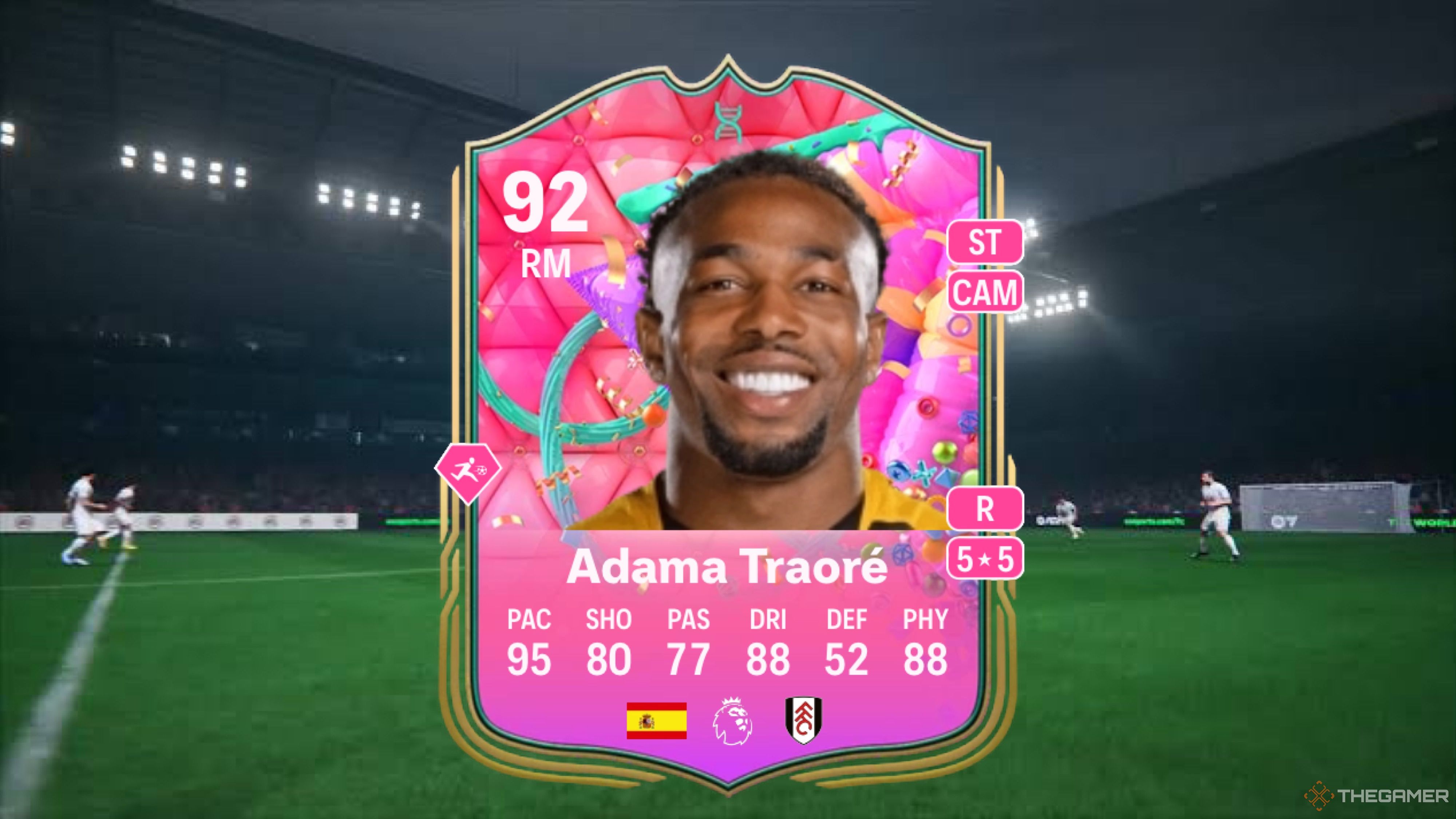 AdamaTraoréDiarraは、このイベントで最初の主要なミッドフィールダーであり、この進化のトップソリッドカードの1つを獲得しています。彼の新しいFETバースデーカードは、彼の主要な位置、攻撃中のミッドフィールダー、またはストライカーである正しいミッドフィールダーとして展開できます。どちらのポジションでも、彼はこれらのポジションを支配するために攻撃、防御、スタミナを持っています。