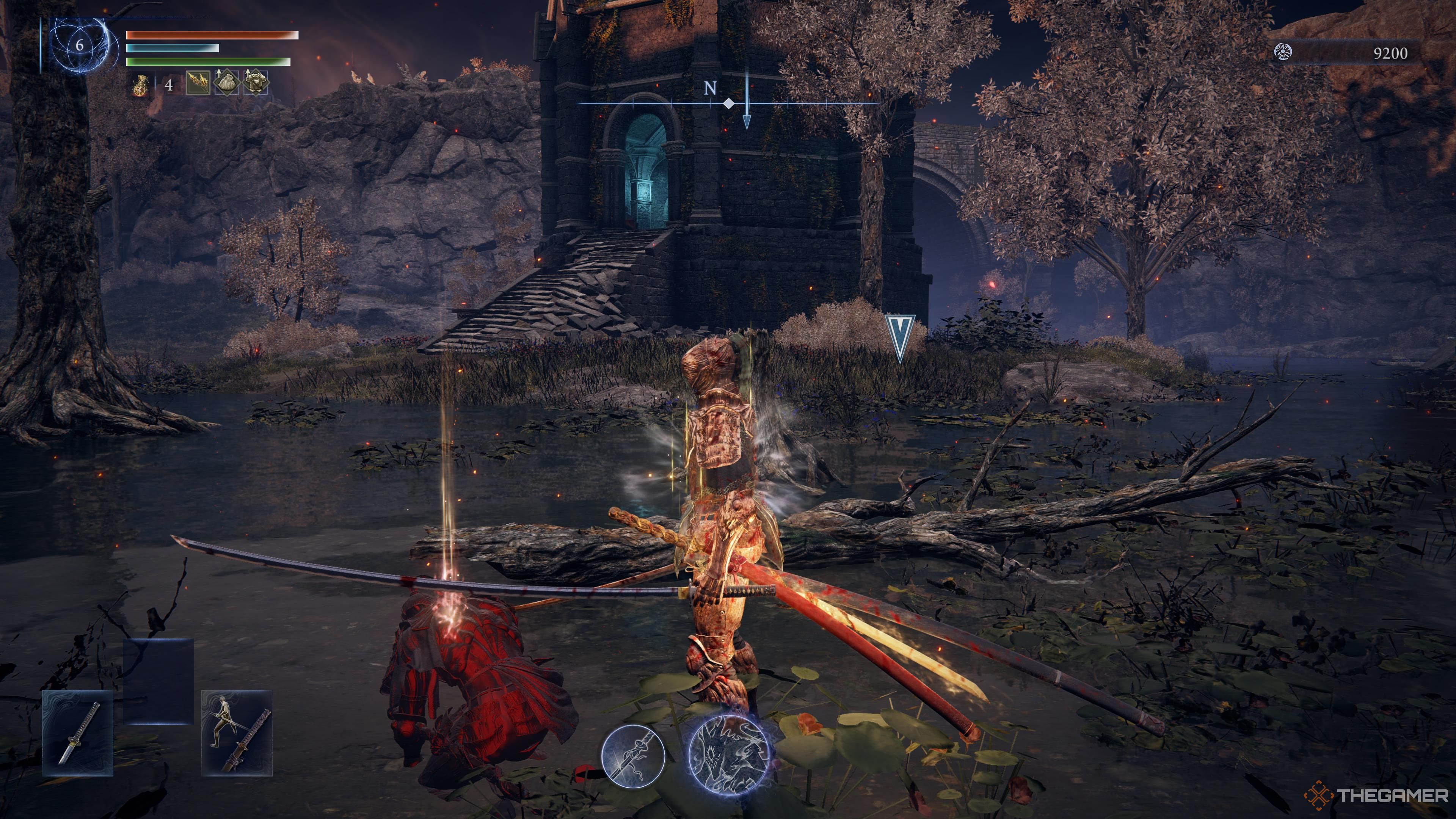 呪われた剣を振り回している間、あなたはヒットする直前にブロックすることにより、攻撃をそらします。あなたはこれを非常に正確にしなければなりませんが、あなたがそれを正しく行ったときに火花は飛ぶでしょう。これは姿勢のダメージを扱います敵に、十分なたわみがガードを完全に壊しています。あなたがそらすほど、呪われた剣が明らかになります、輝く金。