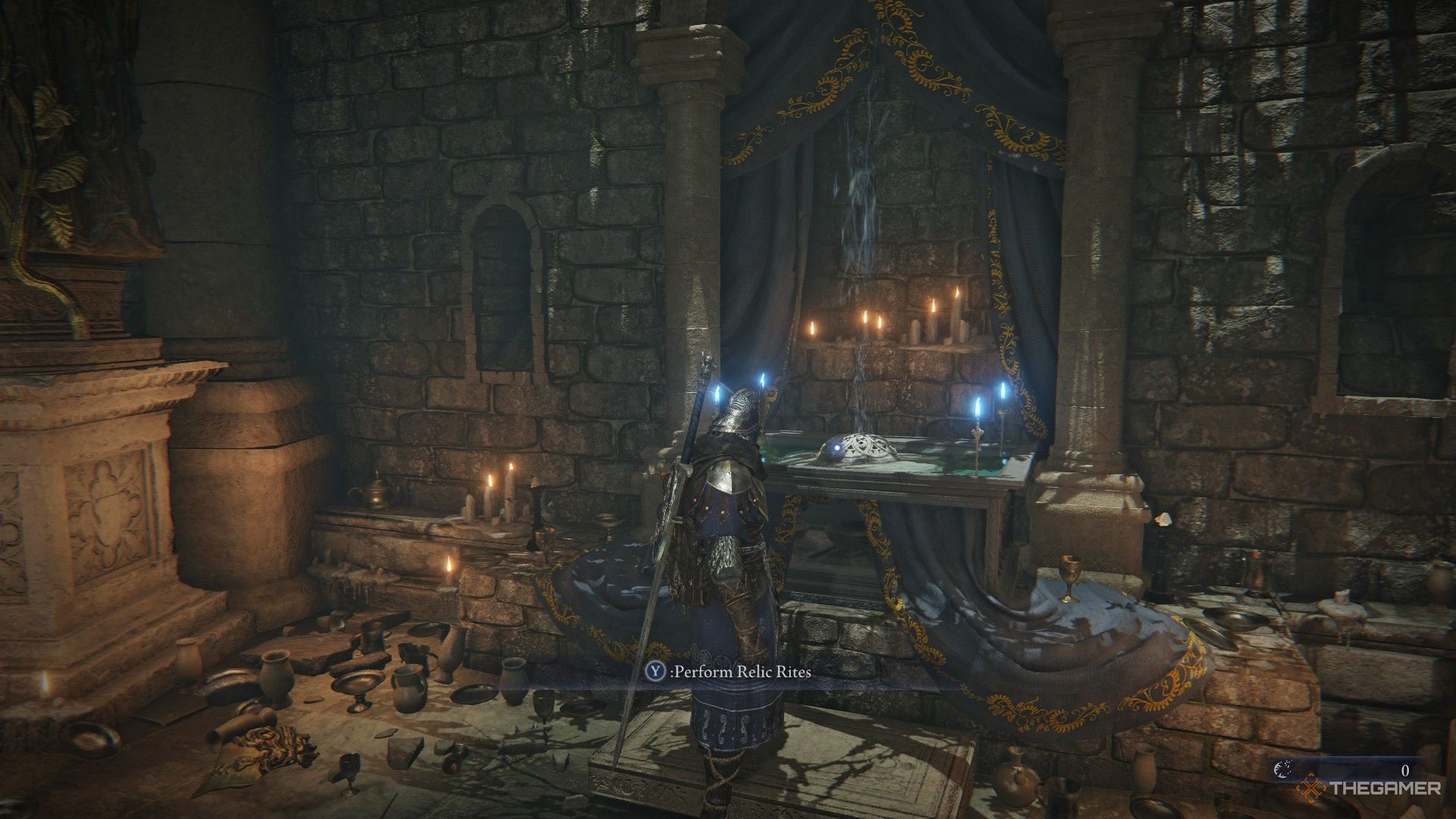 新しい聖杯や新しい遺物を受け取ったら、特別な遺物の祭壇に行きます円卓会議の中心にあります。テーブルの隣に青いろうそくとカーテンがある小さな領域です。