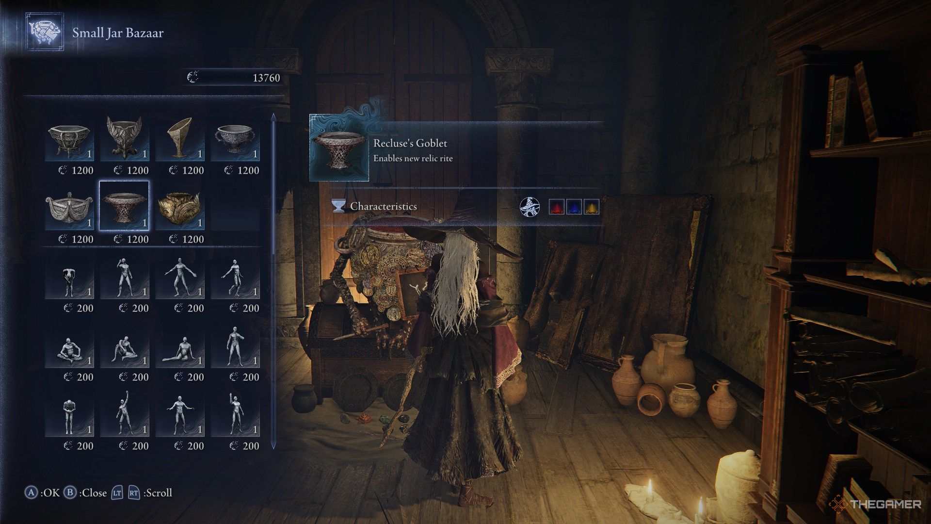 最初から利用できませんが、遠征をさらに進めるにつれて、小さなJar Bazaarはより多くのアイテムを提供します。聖具のために、小さな瓶はあなたがトリセファロスを倒した後に聖杯を販売します。