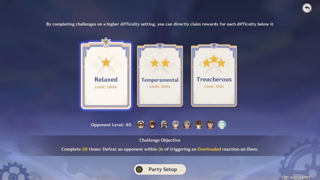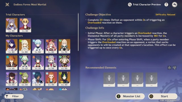 最初の課題と同じように、過負荷の効果を作成できるキャラクターがペアになっているキャラクターが必要です。 2つのトライアル文字を選択します子供そしてクロリンデ、それから、他の2つのPyroとElectroのキャラクターが助けてくれるのはあなた次第です。魚そしてハーレクイン 重いダメージとともに過負荷効果を適用するのに役立つ優れたDPSキャラクターです。