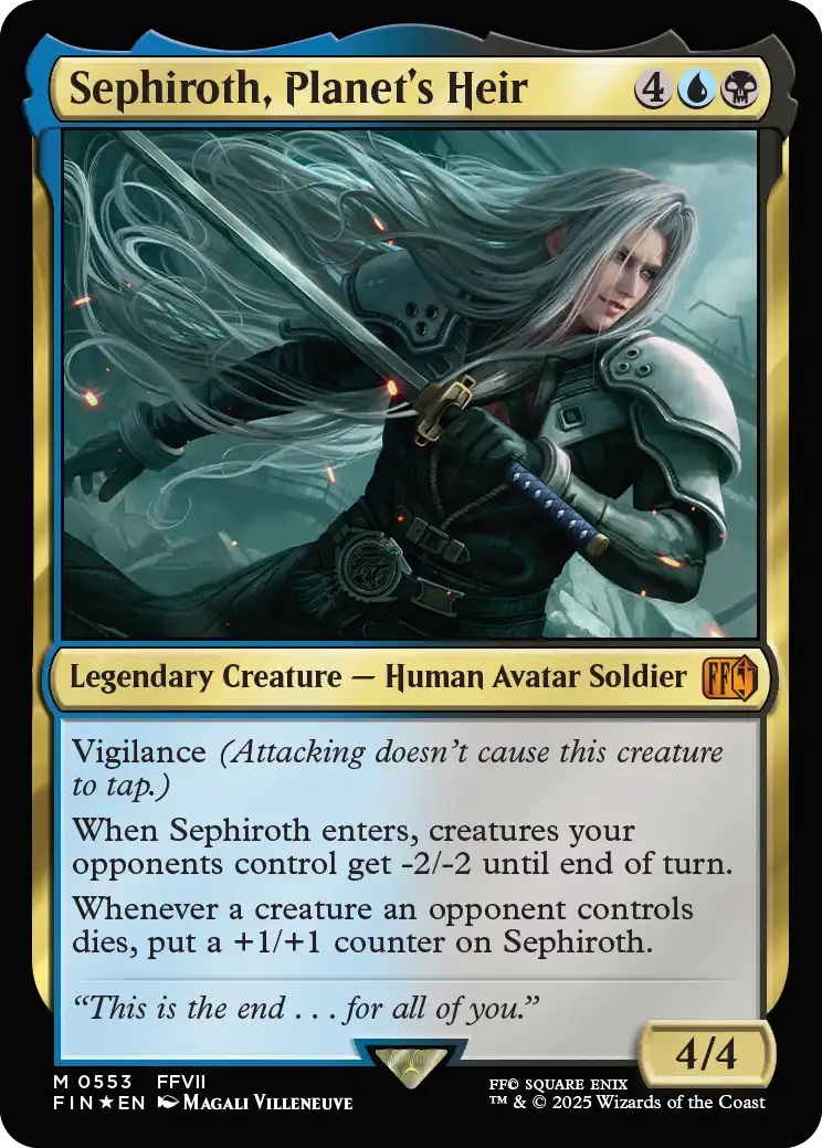 相手がコントロールするクリーチャーが死ぬたびに、セフィロスに +1/ +1カウンターを置きます。
