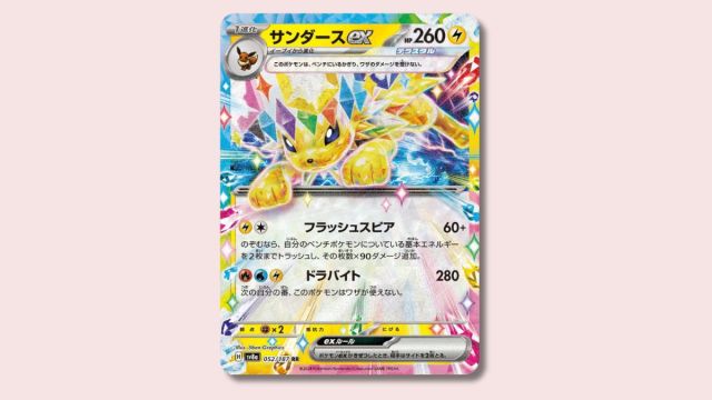 Jolteon Exは、装備のメカニズムを装備しています点滅槍。 60のベースダメージとこれに加えて180の余分なダメージを積み重ねる可能性があるため、ベンチをエネルギー化し、エネルギーカードを維持する方法を見つけることができれば、強力な攻撃です。
