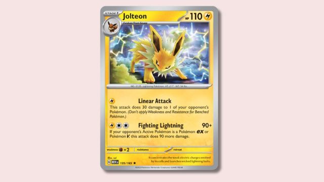 Jolteonは現在、プリズム進化の最も価値のないEeveeltutionカードであり、その形の意味のあるダメージソースは1つだけです稲妻との戦い。これは90のダメージを与えますが、対戦相手のアクティブが元またはVポケモンである場合、180に積み重ねることができます。