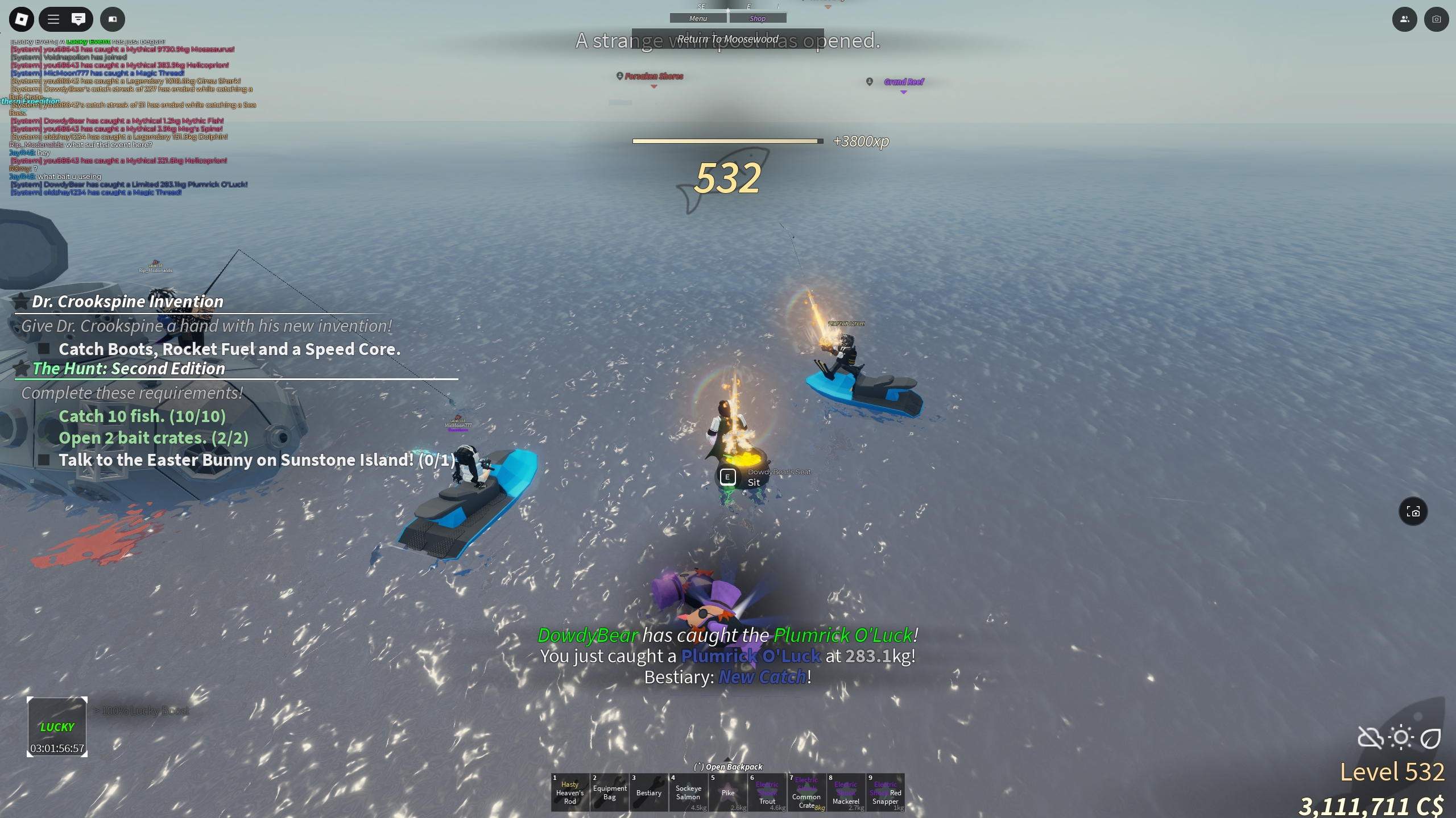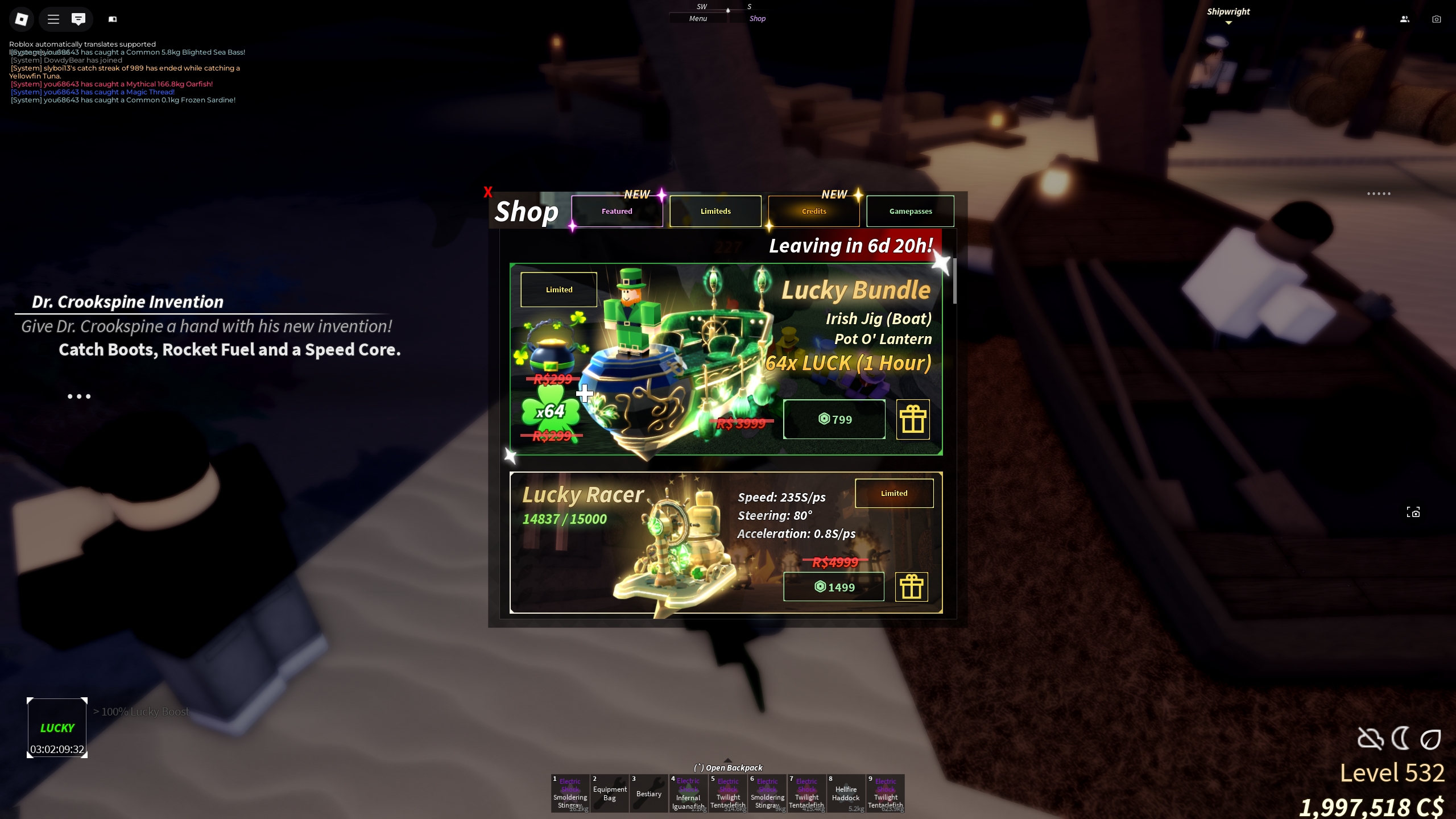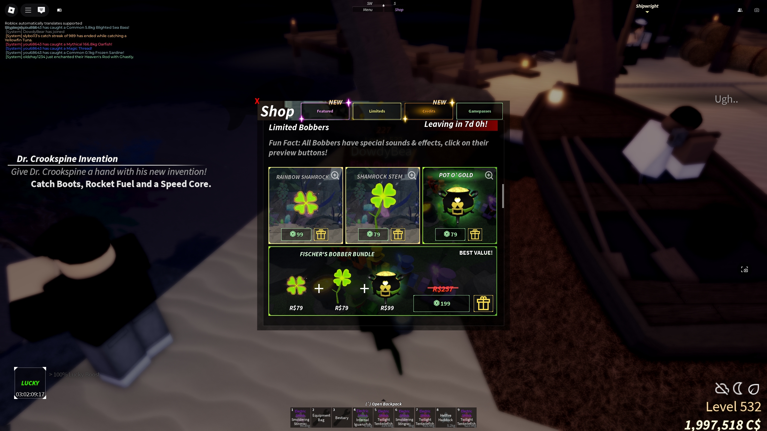 聖パトリックスデイイベント中、すべてのプレイヤーはキャッチで100%余分な運を持っています。これは、マーリンの運が高まっている、オーロラ・ボレアリス、ユニバーサル・ラックベイト、そしてもちろんサーバーの運など、他の運を後押しする効果と積み重ねられます。多分これは最終的に必要なアイテムをキャッチする良い機会ですグリマーツブーツ。