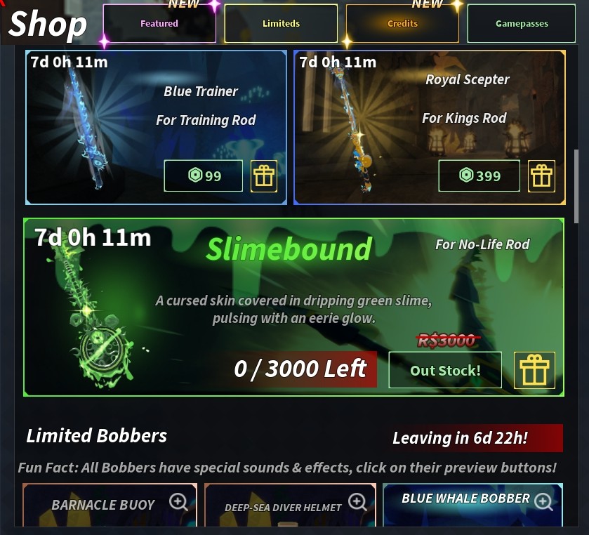 私たちが期待するように、いくつかあります利用可能な新しいプレミアム /リミテッドアイテムとバンドル。あなたが使用している場合に備えてロイヤルセプター、ノーライフロッド、または…トレーニングロッド(真剣に???)、あなたは買うことができます新しい肌彼らのために。 3つの新しいものもありますMoby Dick関連のボーズ割引価格で1つのバンドルで購入できます。