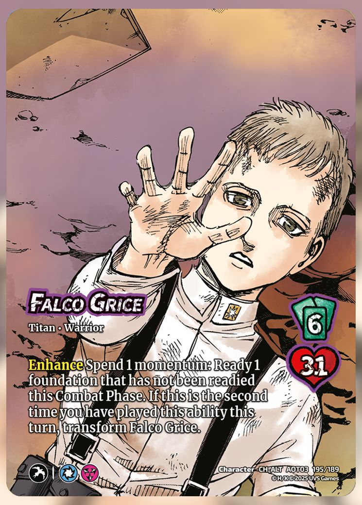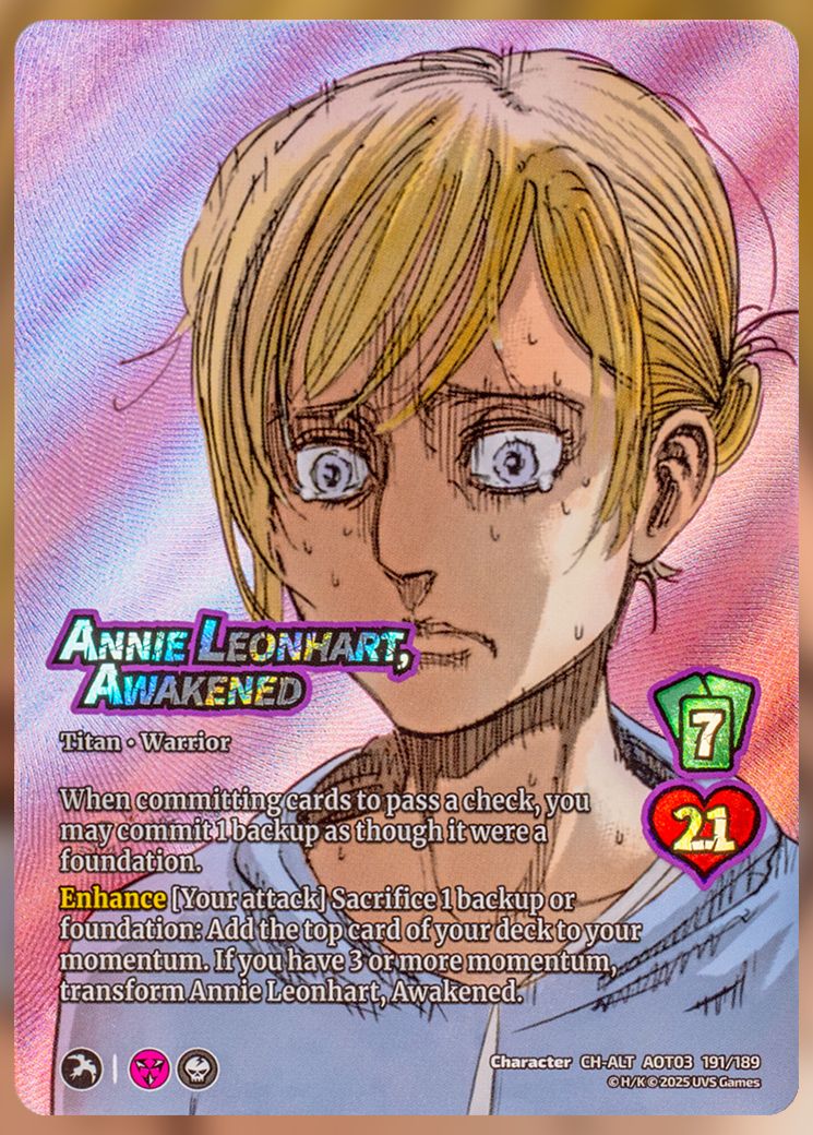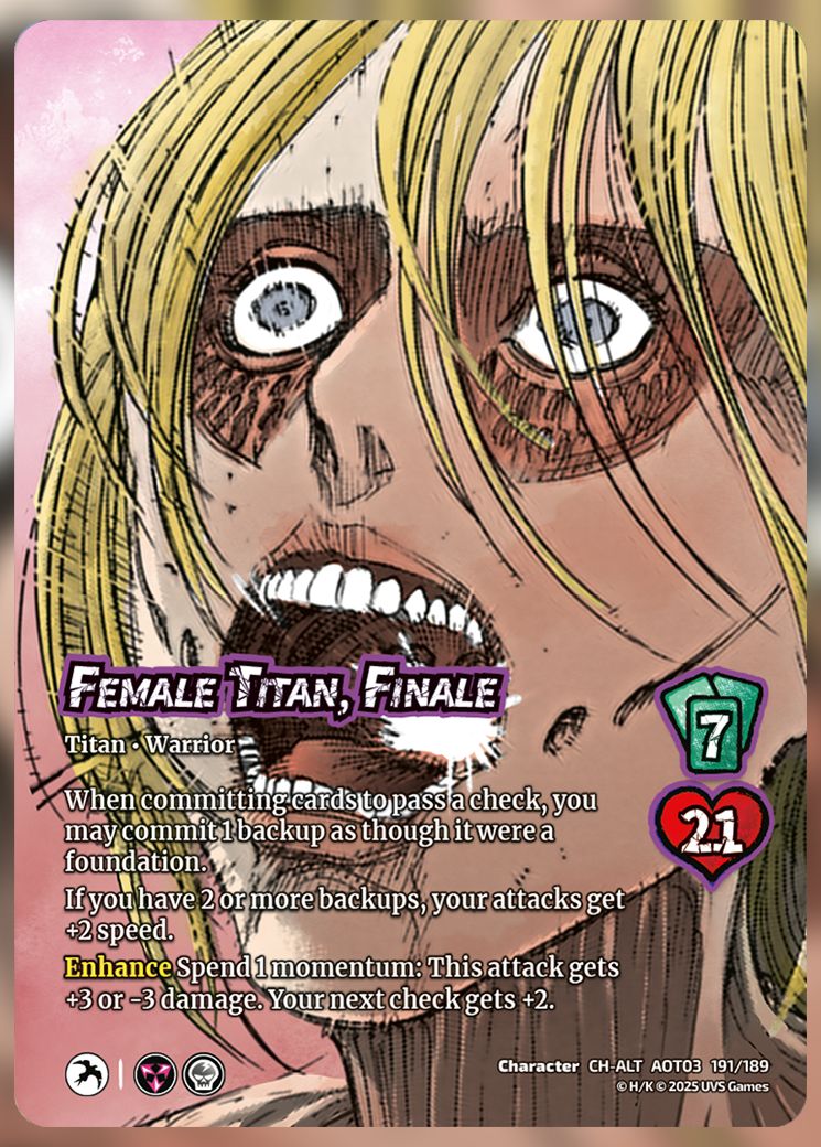 近い | アニー・レオンハート、目覚めたタイタン - 戦士 - 7ハンドサイズ - 21健康 - カオス/死 チェックに合格するためにカードをコミットするとき、それが基盤であるかのように1つのバックアップをコミットすることができます。 強化する[攻撃]犠牲1バックアップまたはFoundatiopn:デッキの一番上のカードを勢いに追加します。 3つ以上の勢いがある場合は、Annie Leonhartを目覚めさせます。 女性タイタン、フィナーレタイタン - 戦士 - 7ハンドサイズ - 21健康 - カオス/死 チェックに合格するためにカードをコミットするとき、それが基盤であるかのように1つのバックアップをコミットすることができます。 2つ以上のバックアップがある場合、攻撃は+2速度になります。 強化する1つの勢いを費やす:この攻撃は+3または-3のダメージを与えます。次の小切手は+2になります。 |