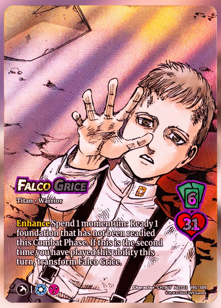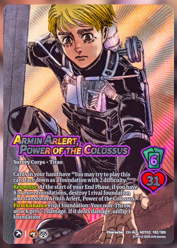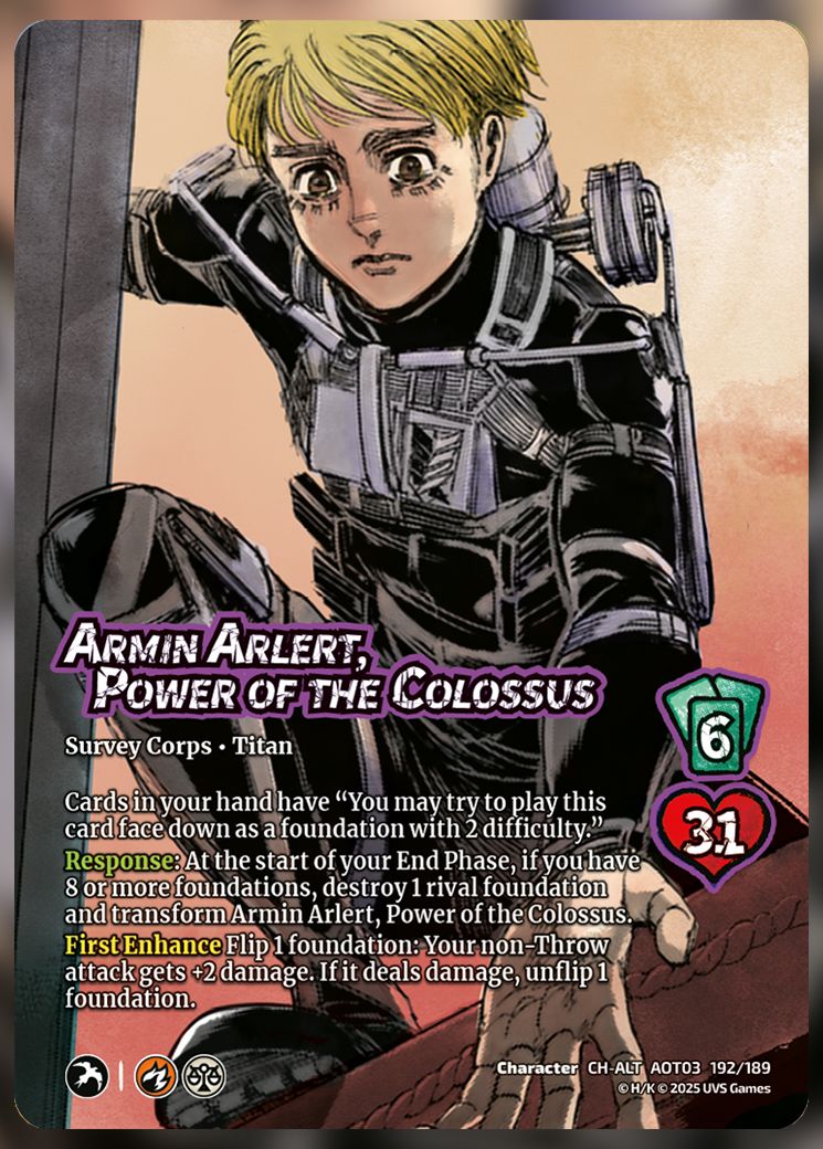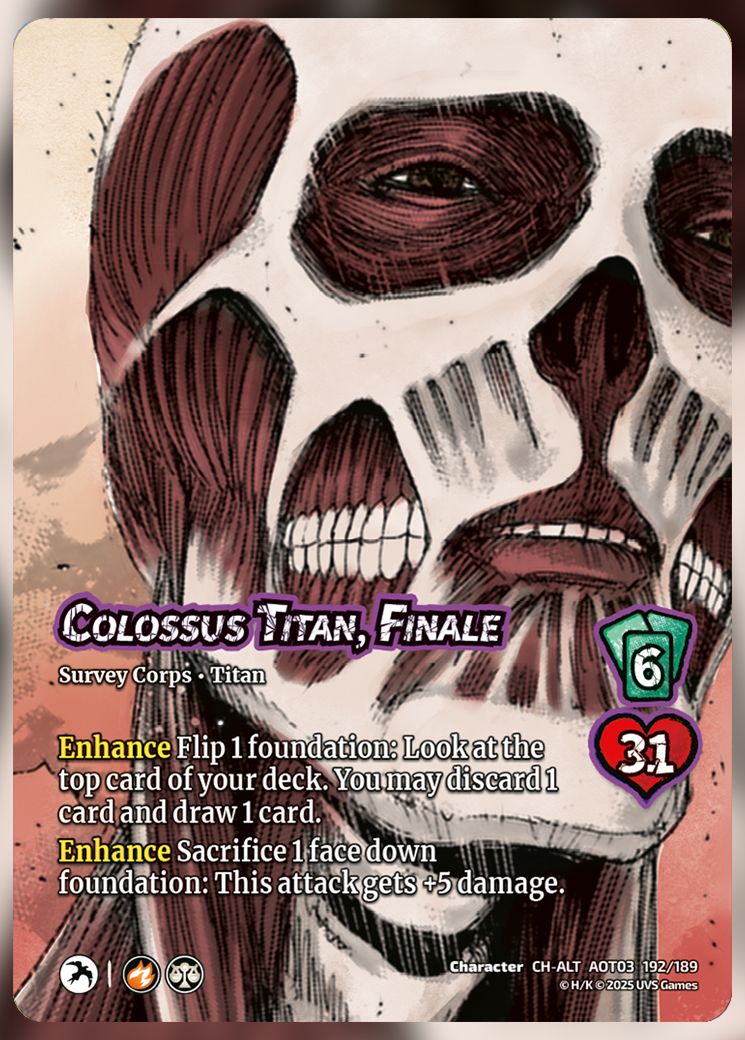 近い | Armin Arlert、Colossusの力調査隊 - タイタン - 6ハンドサイズ - 31健康 - 火災/注文 あなたの手にあるカードには、「このカードを2つの難易度を持つ基盤としてめちゃくちゃにしようとすることができます。」 応答:最終段階の開始時に、8つ以上の財団がある場合は、1つのライバルの基礎を破壊し、Colossusの力であるArmin Arlertを変換してください。 最初に強化しますFlip 1 Foundation:非スロー攻撃は+2ダメージを受けます。ダメージを与える場合は、Unfrip 1 Foundationです。 Colossus Titan、フィナーレ調査隊 - タイタン - 6ハンドサイズ - 31健康 - 火災/注文 強化するFlip 1 Foundation:デッキの一番上のカードを見てください。 1枚のカードを破棄して、1枚のカードを描画できます。 強化する犠牲1 Found Down Foundation:この攻撃は+5のダメージを受けます。 |