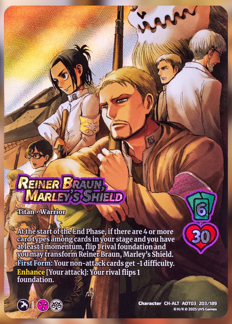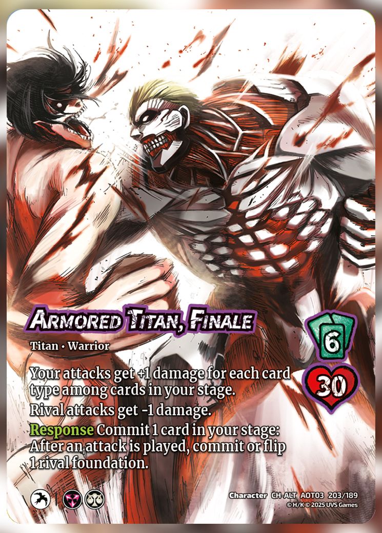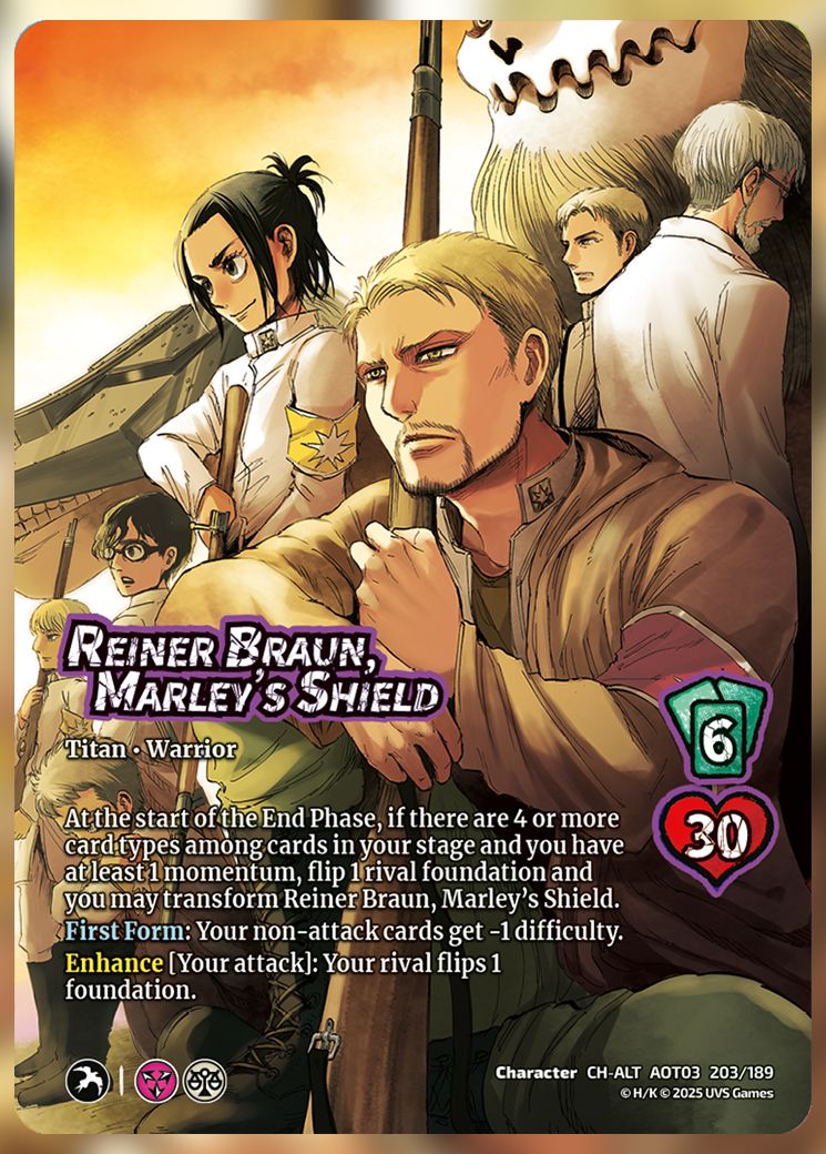近い | Reiner Braun、Marley's Shieldタイタン - 戦士 - 6ハンドサイズ - 30ヘルス - カオス/注文 エンドフェーズの開始時に、ステージにカード間に4つ以上のカードタイプがあり、少なくとも1つの勢いがある場合、1つのライバルファンデーションをフリップすると、マーリーのシールドであるReiner Braunを変えることができます。 最初のフォーム:攻撃以外のカードは-1難易度を得ます。 強化する[あなたの攻撃]:あなたのライバルはフリップ1の基礎をフリップします。 装甲タイタン、フィナーレタイタン - 戦士 - 6ハンドサイズ - 30ヘルス - カオス/注文 攻撃は、ステージのカード間で各カードタイプで+1ダメージを受けます。 ライバル攻撃は-1ダメージを受けます。 応答ステージで1枚のカードをコミット:攻撃が再生された後、1つのライバルファンデーションをコミットまたはフリップします。 |