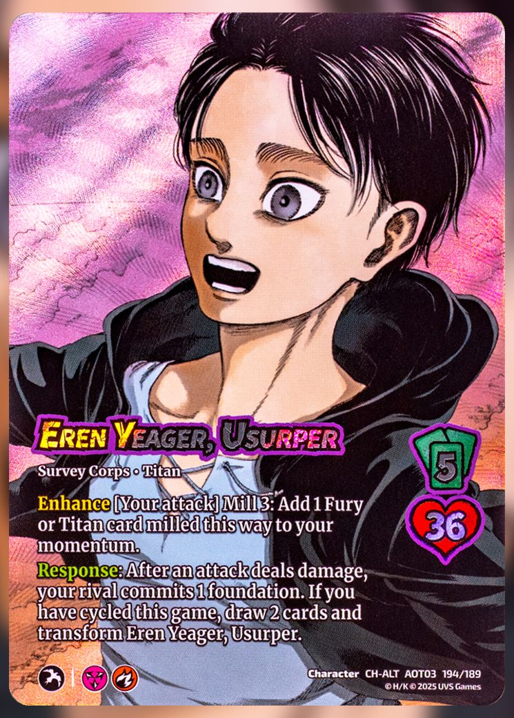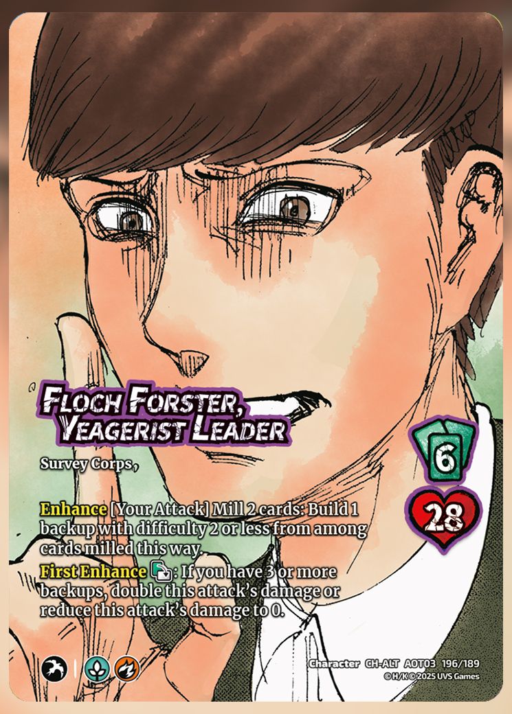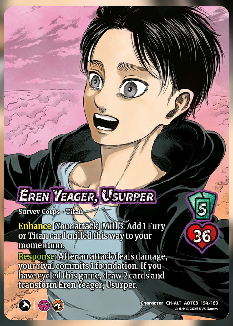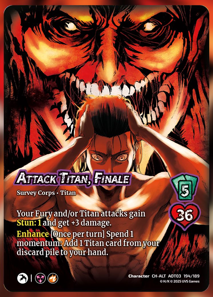 近い | エレン・イェーガー、調査隊 - タイタン - 5ハンドサイズ - 36ライフ - カオス/火 強化する[攻撃]ミル3:フューリーまたはタイタンカードを追加して、このように勢いを増します。 応答:攻撃が損害を与えた後、ライバルは1財団をコミットします。このゲームをサイクリングした場合は、2枚のカードを描画し、Eren Yeagerを変身させます。 攻撃タイタン、フィナーレ調査隊 - タイタン - 5ハンドサイズ - 36健康 - カオス/火 お勧めの読み取り:タイタン映画の攻撃は日本で劇場に登場しますが、「最後の攻撃」がいつ私たちにリリースされるのでしょうか? あなたの怒りやタイタンの攻撃が利益を得ますスタン:1+3ダメージを受けます。 強化する[ターンごとに1回] 1つの勢いを使う:捨てられた山から1枚のタイタンカードを手に追加します。 |