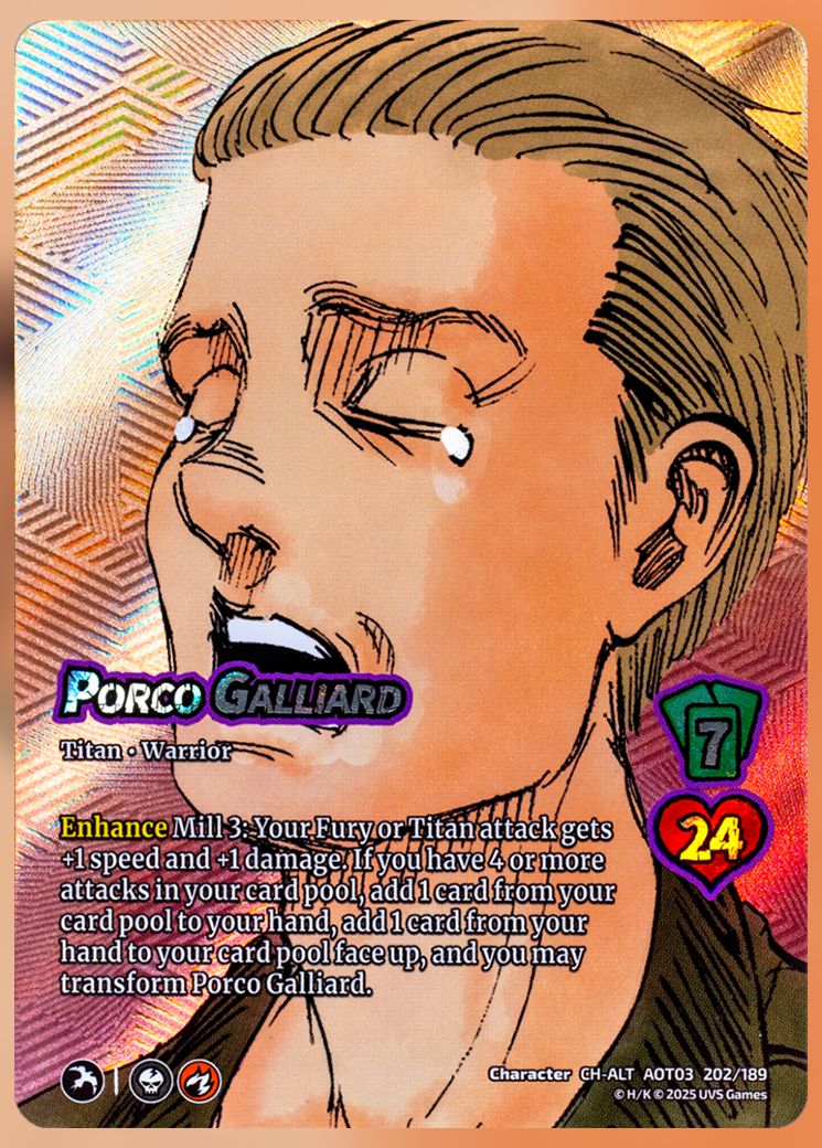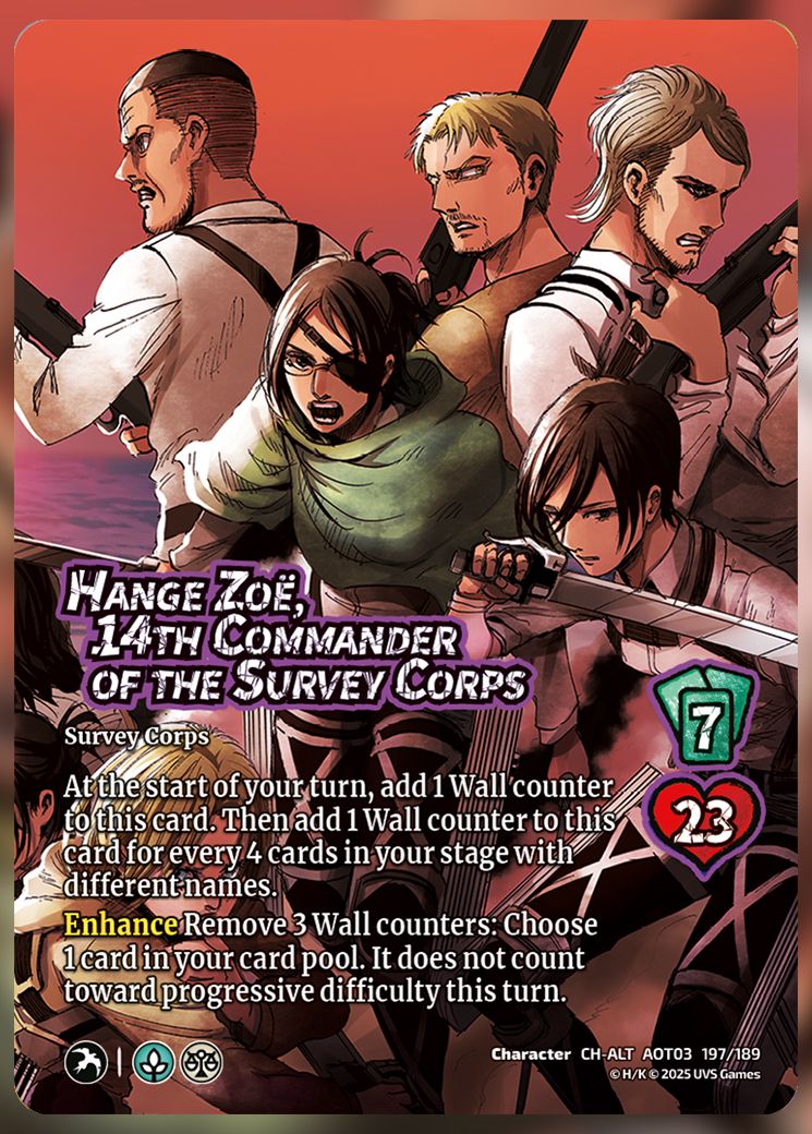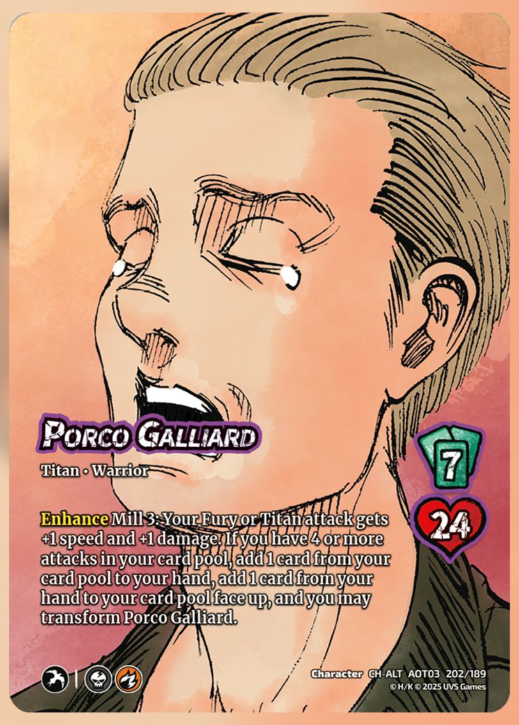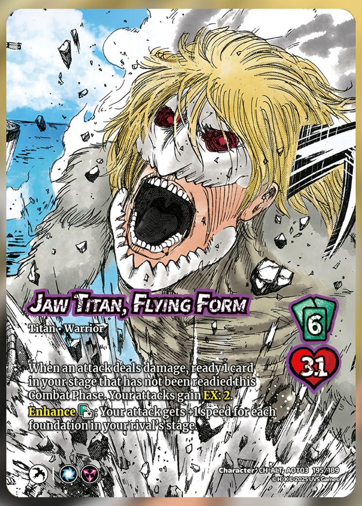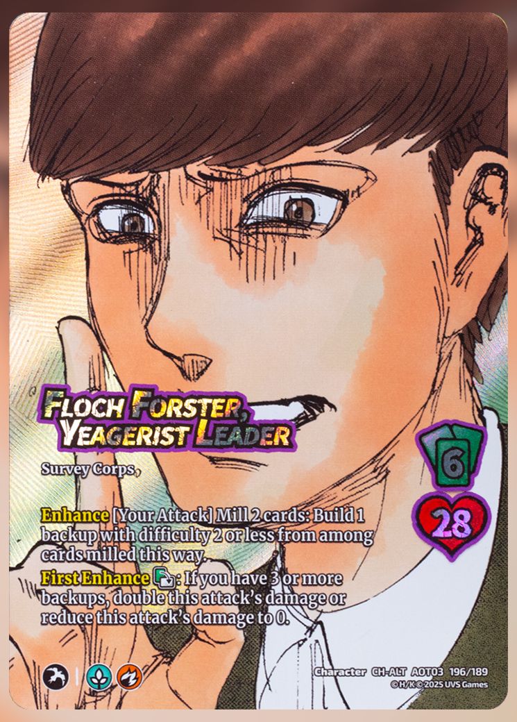 近い | エレン・イェーガー、調査隊 - タイタン - 5ハンドサイズ - 36ライフ - カオス/火 強化する[攻撃]ミル3:フューリーまたはタイタンカードを追加して、このように勢いを増します。 応答:攻撃が損害を与えた後、ライバルは1財団をコミットします。このゲームをサイクリングした場合は、2枚のカードを描画し、Eren Yeagerを変身させます。 攻撃タイタン、フィナーレ調査隊 - タイタン - 5ハンドサイズ - 36健康 - カオス/火 お勧めの読み取り:タイタン映画の攻撃は日本で劇場に登場しますが、「最後の攻撃」がいつ私たちにリリースされるのでしょうか? あなたの怒りやタイタンの攻撃が利益を得ますスタン:1+3ダメージを受けます。 強化する[ターンごとに1回] 1つの勢いを使う:捨てられた山から1枚のタイタンカードを手に追加します。 |