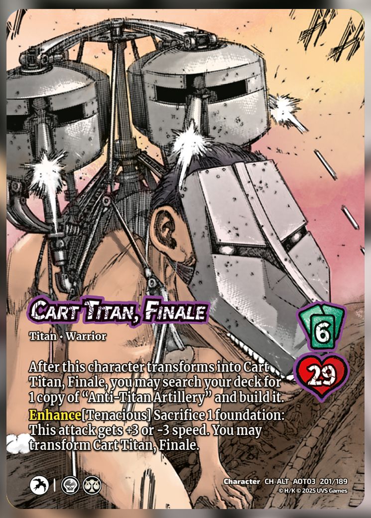 近い | Pieck Finger、Panzerユニットカートマンタイタン - 戦士 - 6ハンドサイズ - 29生涯 - 死/注文強化するコミット:デッキの一番上のカードを下にします。 最初に強化します[粘り強い]犠牲1基礎:この攻撃は+2または-2のダメージを受けます。パンツァーユニットカートマン、ピエックフィンガーを変えることができます。 カートタイタン、フィナーレタイタン - 戦士 - 6ハンドサイズ - 29健康 - 死/注文 このキャラクターがカートタイタン、フィナーレに変身した後、デッキを検索して、「反ティタン砲兵」のコピーを1コピーして構築できます。 強化する[粘り強い]犠牲1基礎:この攻撃は+3または-3速度になります。カートタイタン、フィナーレを変えることができます。 |