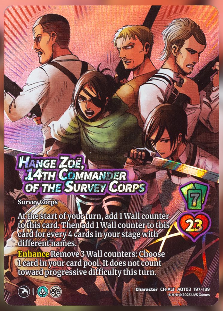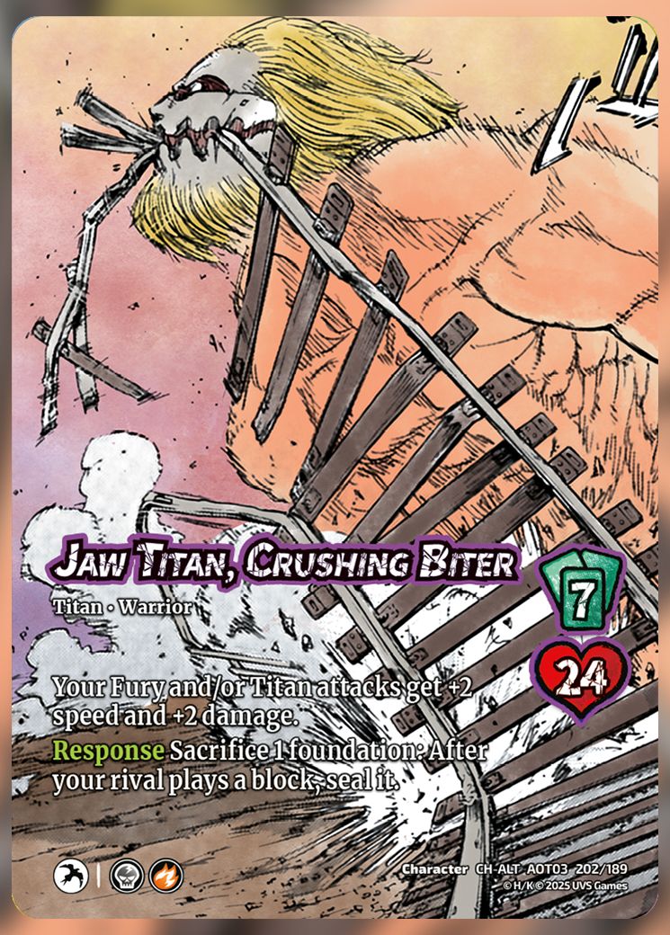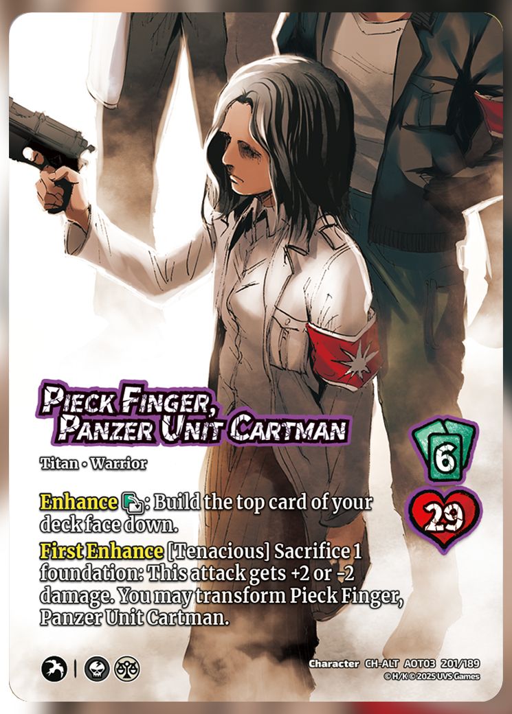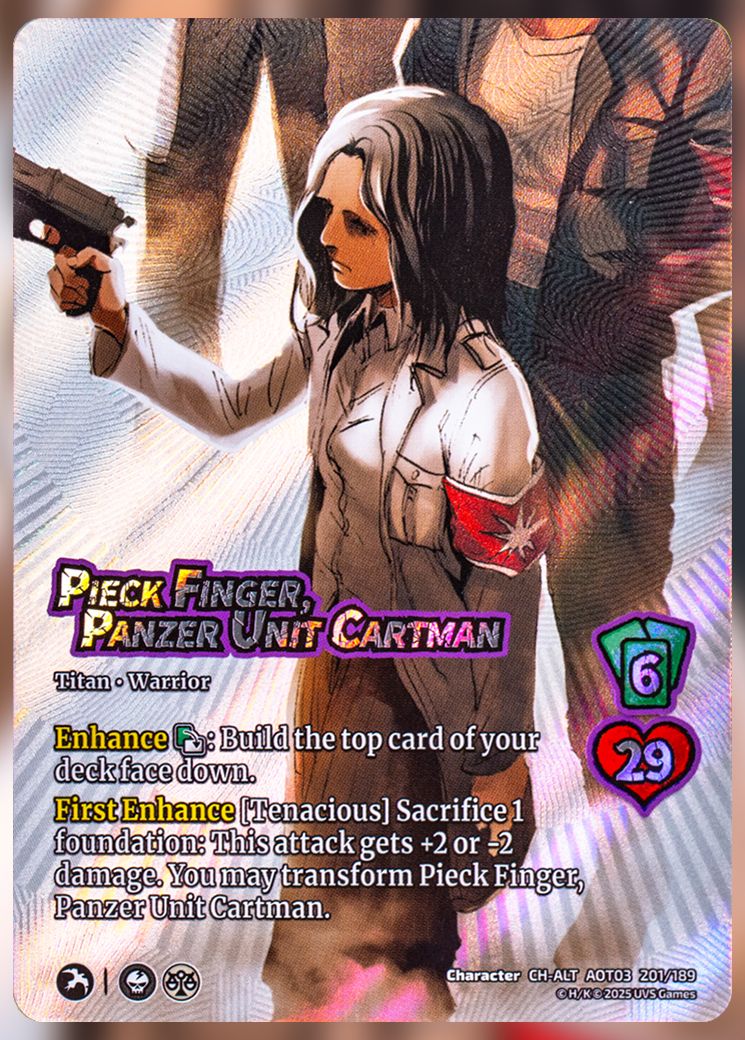芸術的には、これはタイタンセットに対する3つの攻撃すべての中で私のお気に入りだと思います。それらはすべて漫画のアートを使用していますが、ここのカードに配置されている方法は、他のセットが完全に釘付けしなかった方法で絶対に見事に見えます。私は本当に装甲のタイタンとピエックの指で色を掘り、ミカサ、ジャン、コニーのフレーミングもすべて際立っています。