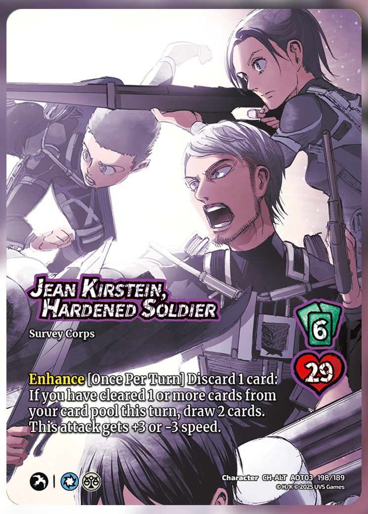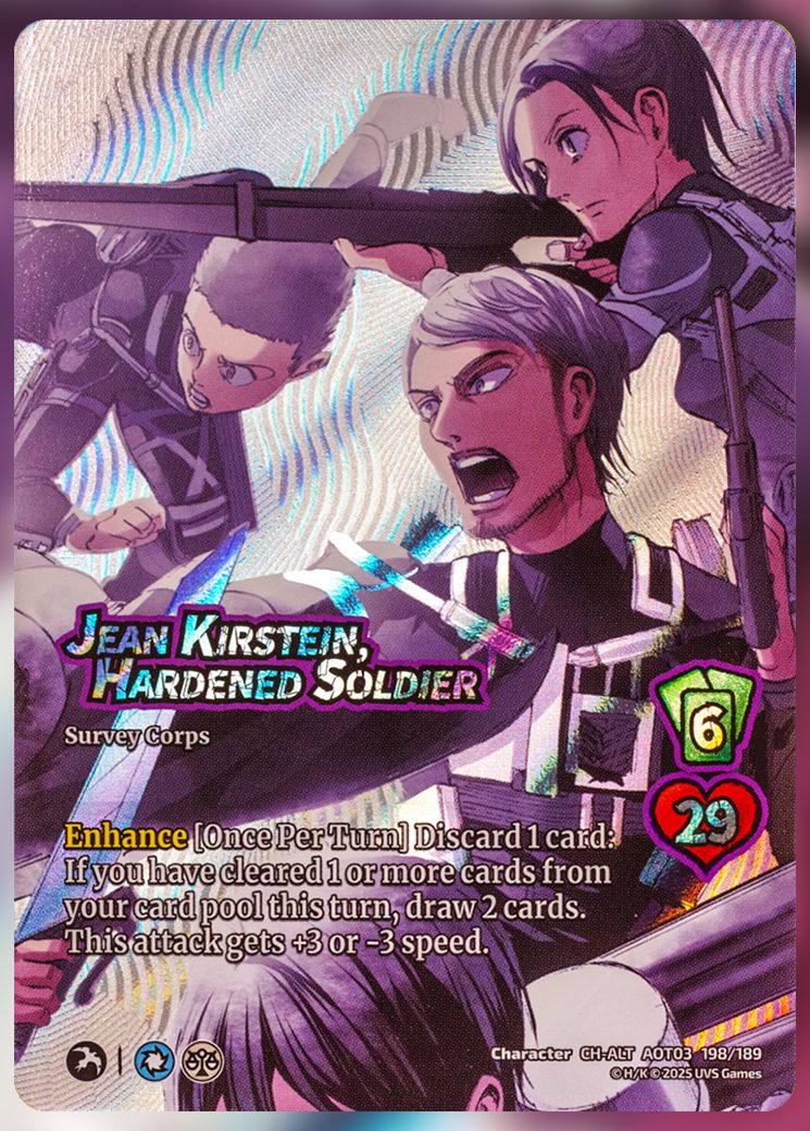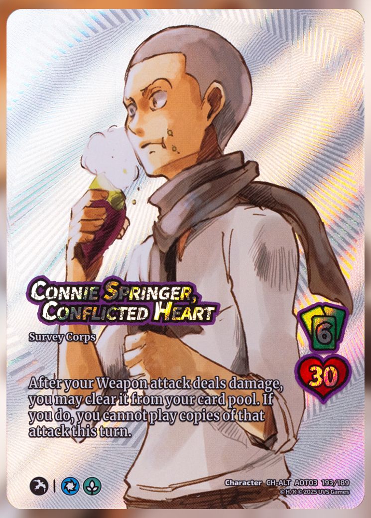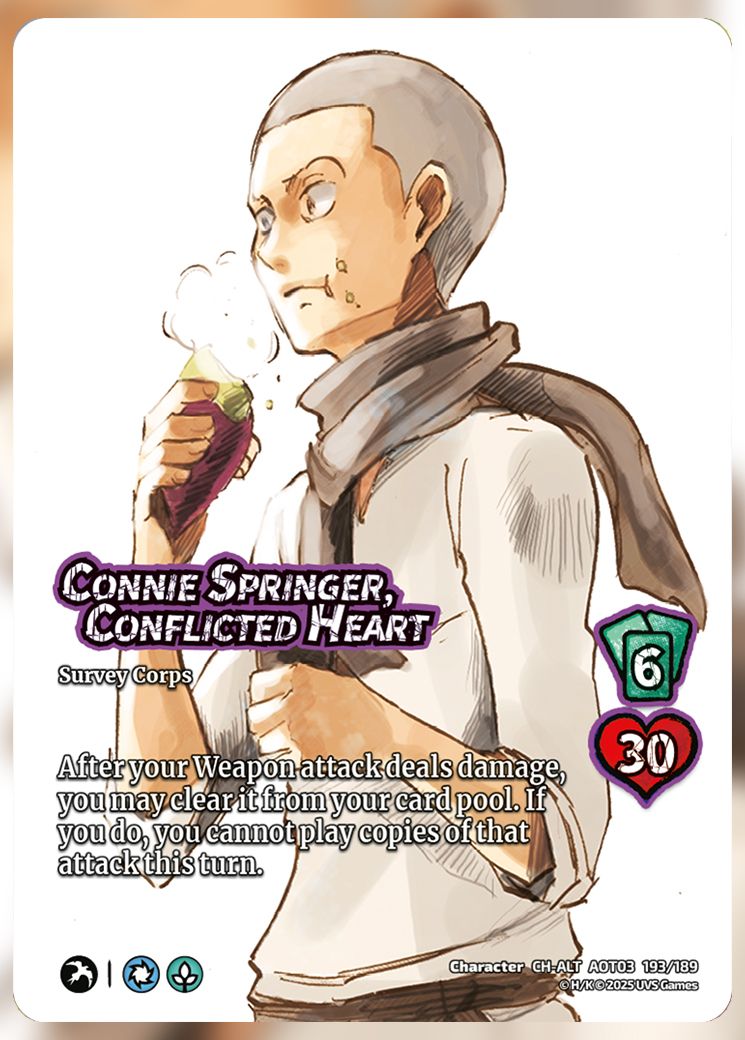 芸術的には、これはタイタンセットに対する3つの攻撃すべての中で私のお気に入りだと思います。それらはすべて漫画のアートを使用していますが、ここのカードに配置されている方法は、他のセットが完全に釘付けしなかった方法で絶対に見事に見えます。私は本当に装甲のタイタンとピエックの指で色を掘り、ミカサ、ジャン、コニーのフレーミングもすべて際立っています。