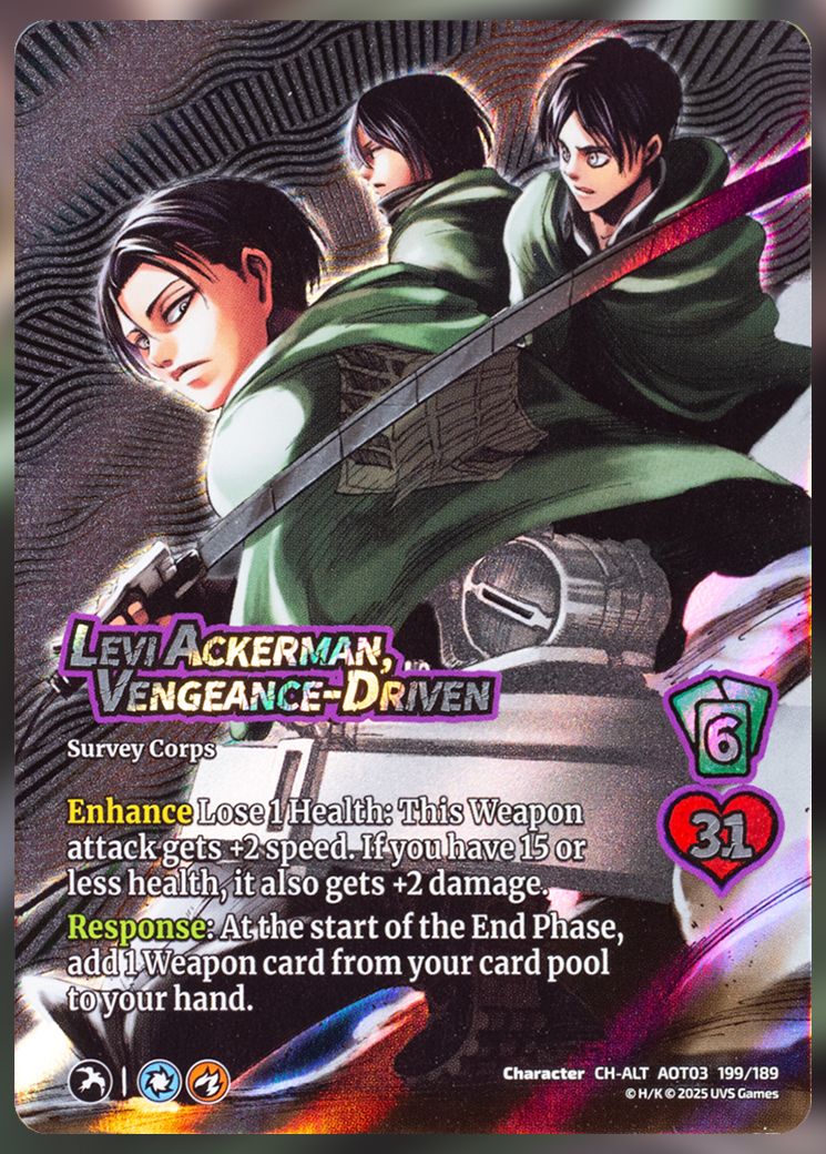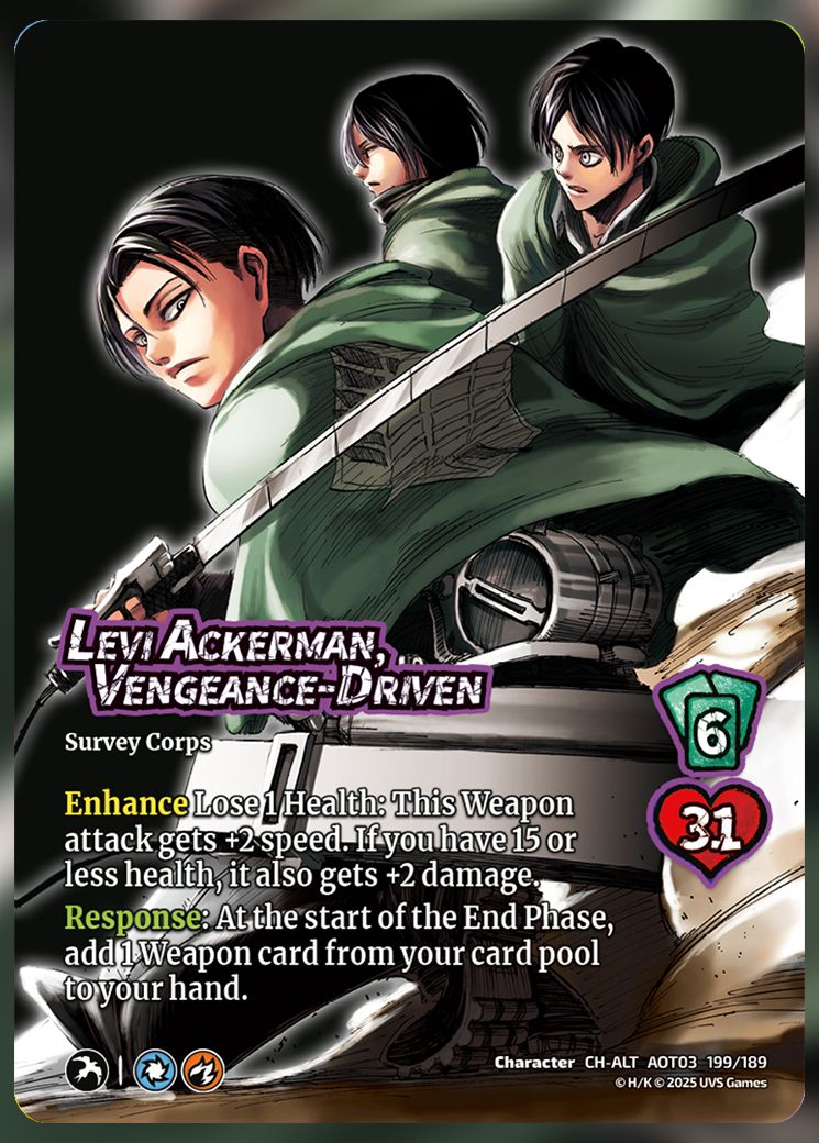 近い | レヴィ・アッカーマン、復ge駆動型調査隊 - 6手のサイズ - 31健康 - 空気/火災 強化する1ヘルスを失う:この武器攻撃は+2速度になります。 15以下の健康状態がある場合、+2のダメージも得られます。 応答:終了フェーズの開始時に、カードプールから1枚の武器カードを手に追加します。 |